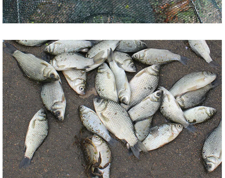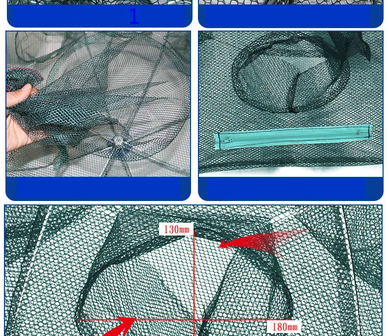 2. El agujero del modelo 8 tiene un fondo de la jaula. La parte inferior de la jaula está diseñada con un agujero para atrapar peces y un bolsillo para cebo, y está equipada con una cremallera de alta resistencia para mayor durabilidad.