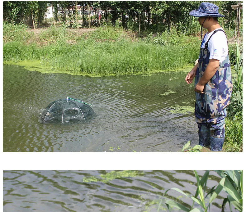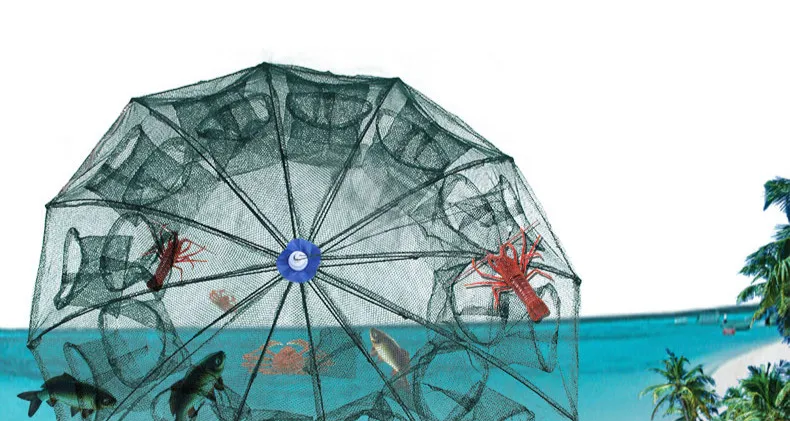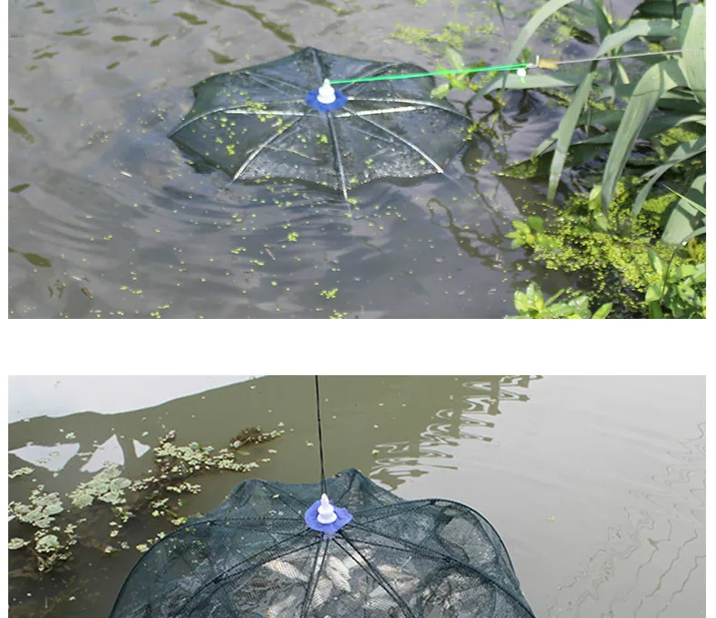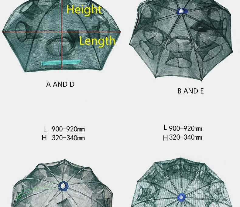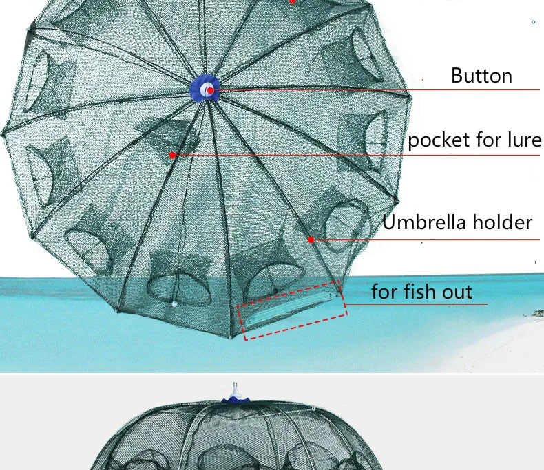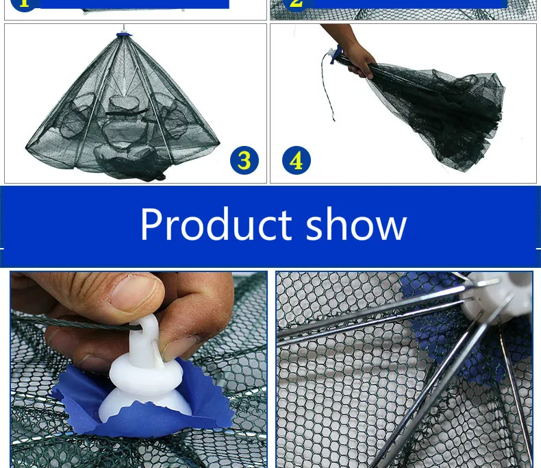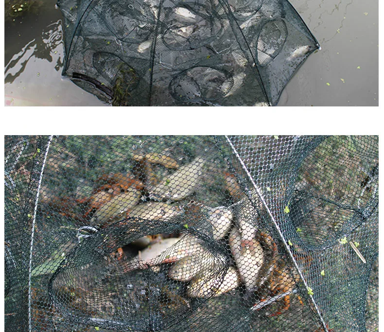 1. Este producto adopta un esqueleto atrevido tipo paraguas, resistente y duradero, no se oxida fácilmente. Está hecho a mano con malla fina de polietileno para ojos. Tiene una entrada de camarones entre cada dos costillas. El exterior grande y el interior pequeño hacen que sea fácil de entrar pero difícil de salir para peces, camarones, cangrejos, etc.