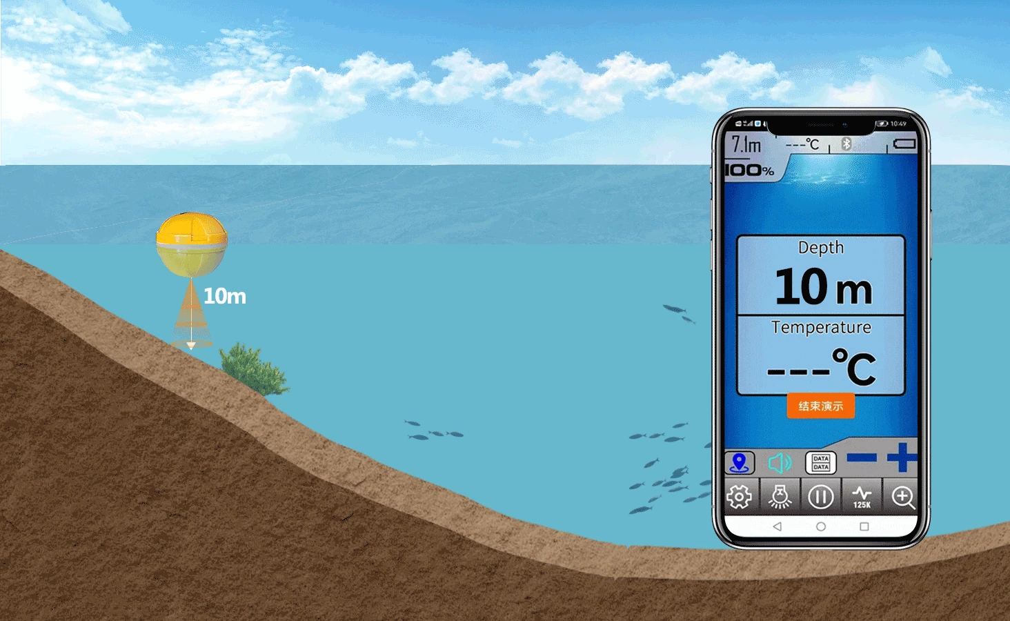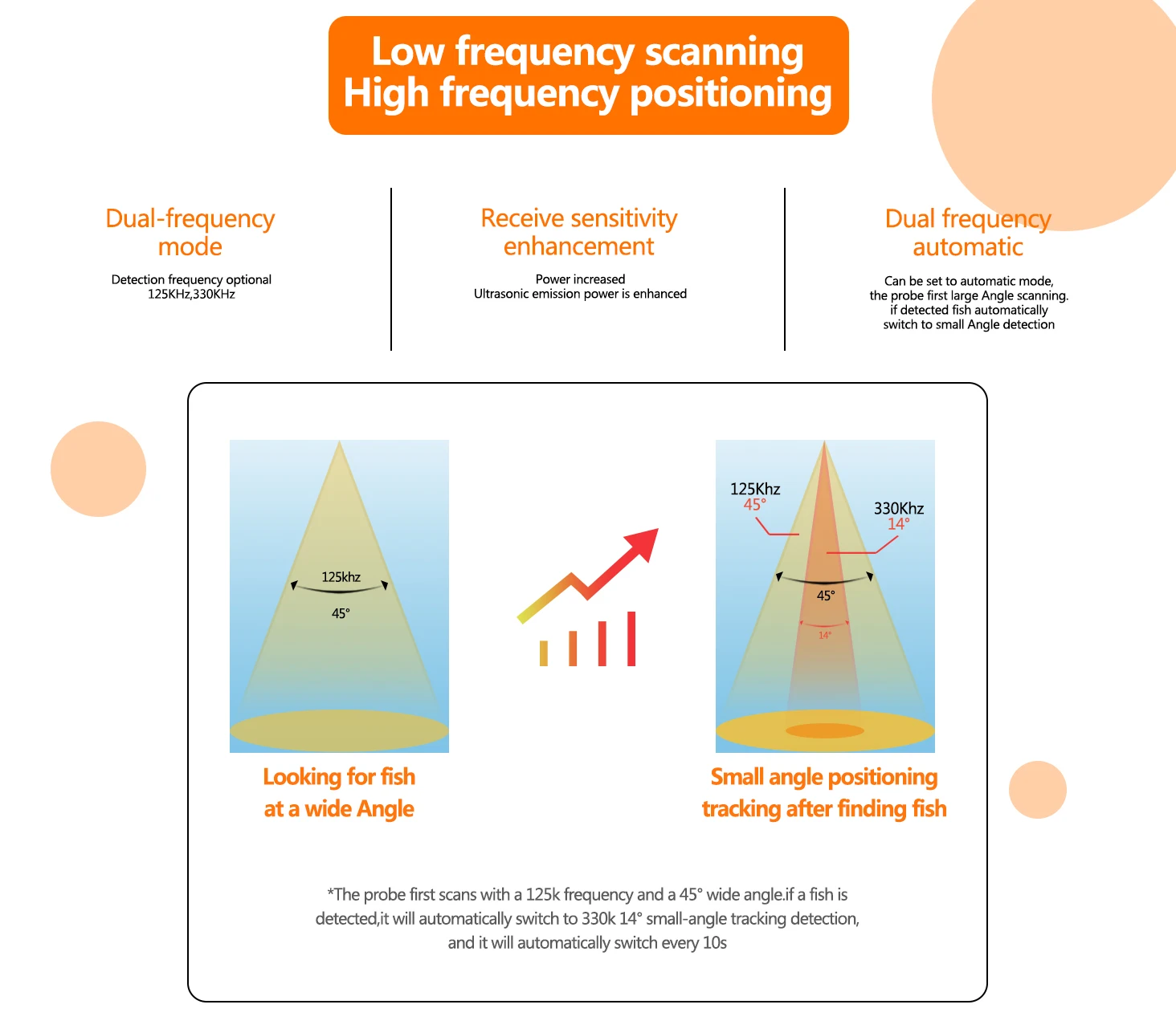 • Rangía de detección de 0.6-73 metros :Con una amplia gama de detección de 0.6-73 metros, este dispositivo puede identificar peces en un entorno acuático extensivo.
