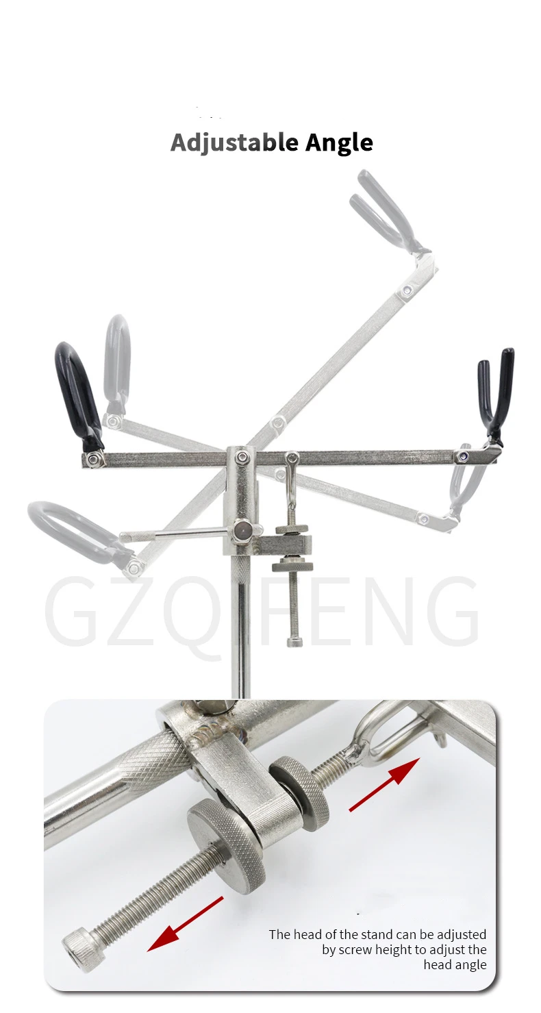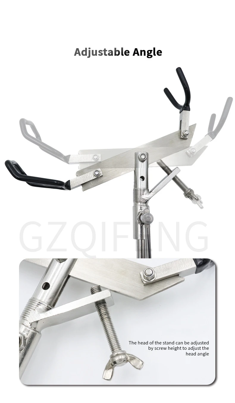 2.Ángulo ajustable, la cabeza del bastidor se puede ajustar ajustando la altura del tornillo para ajustar el ángulo.
