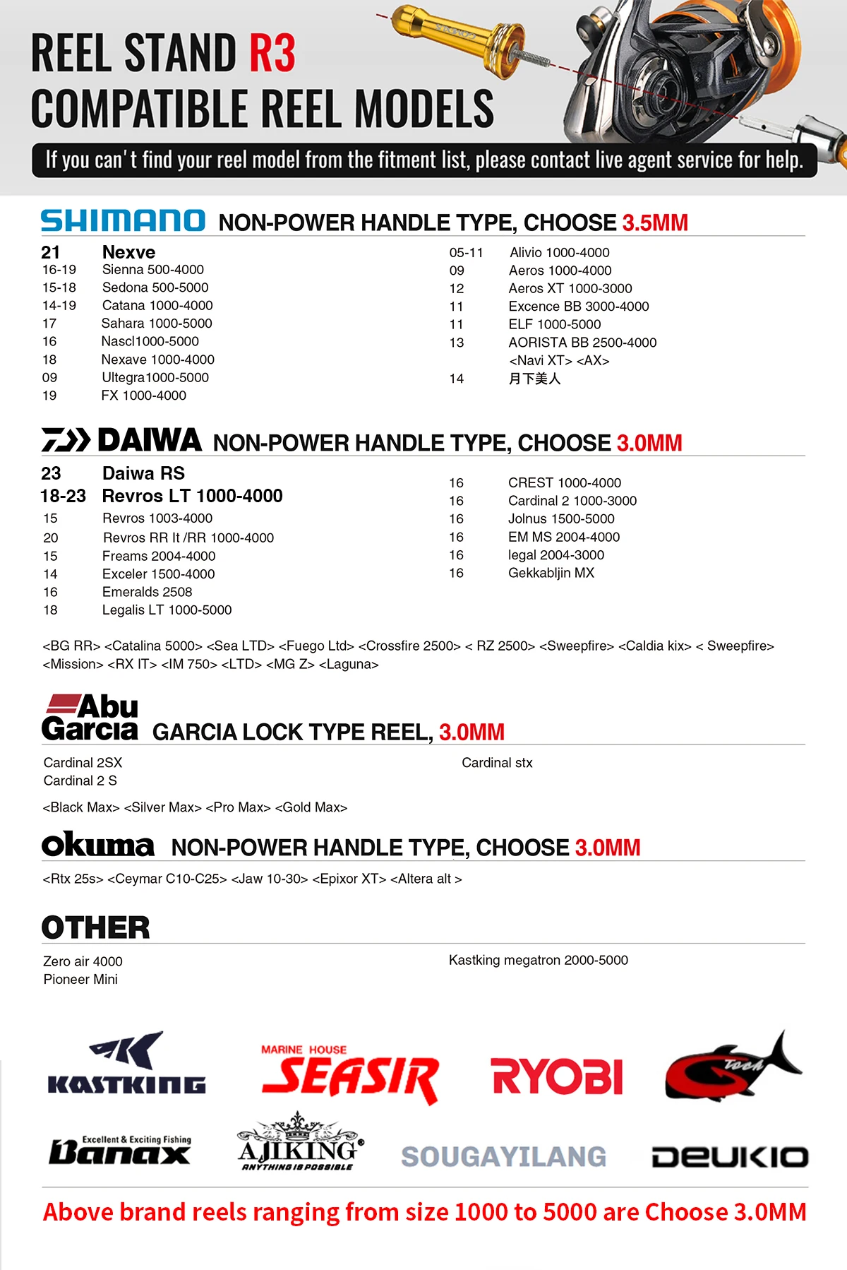 perdí soporte de bloqueo original y probé suerte, afortunadamente es compatible con carrete RAPALA EKLIPS 7000A, por su tornillo de 3,5mm o M3,5 vine con golilla o arandela metálica de 3. 5mm, dos arandelas de goma de 35mm, dos repuestos de goma arandela de 10mm y un repuesto para enganchar anzuelo, llego a Chile antes de tiempo, recomiendo vendedor.