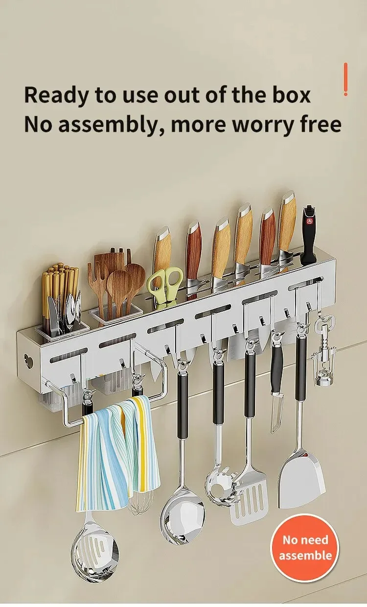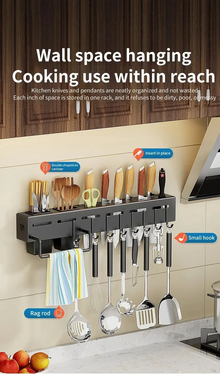 Soporte para cuchillos montado en la pared, estante de almacenamiento multifuncional para cocinas domésticas, sin perforaciones, tubos de palillos, almacenamiento integrado