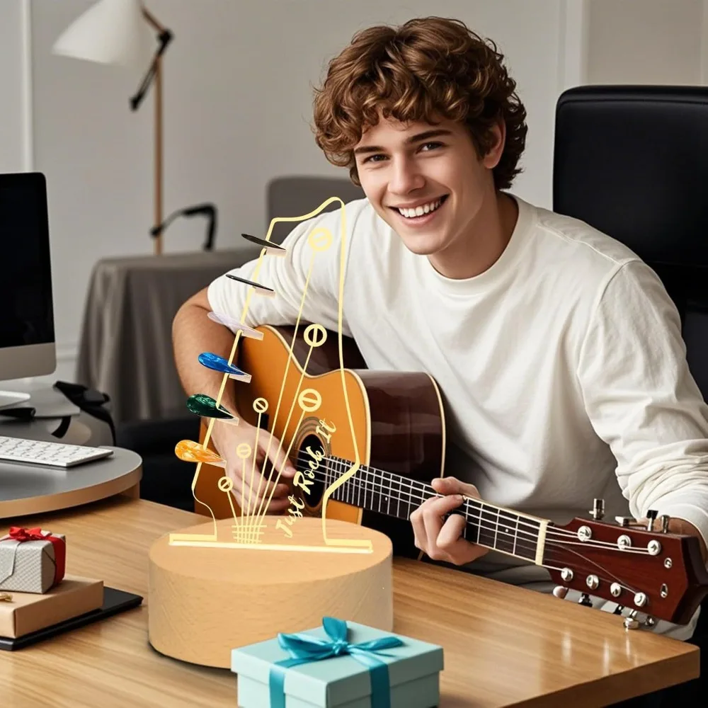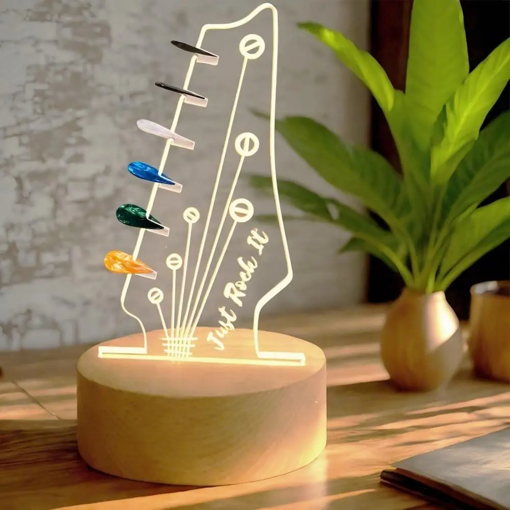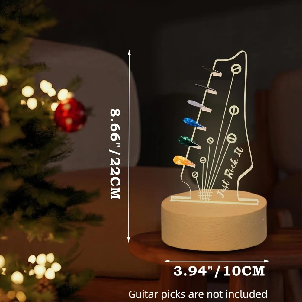 Type:Guitar pick holder Size:As shown Color:Clear Material:Wood+acrylic Power supplies:Usb charging Package includes:1pc guitar pick holder(guitar picks are not included) Features: Light Up Your Passion: This guitar pick holder is in the shape of an electric guitar headstock, making it an outstanding choice for any music lover or musician. The built-in LED light of the pick holder brings life to your space and is a great addition to your guitar decor and guitar collection. Material: The guitar pick holder is made of high-quality solid wood and acrylic, which ensures long-term use, making it an excellent guitar display stand. The simple design and practicality allow it to match any decor. Home Decorative Small Bauble: The unique design of the guitar pick holder can be a cool addition to your desk, bookcase, studio or bookshelf, adding an artistic touch to your home while celebrating your love of music. This guitar pick display holder can enhance your space with high-quality music decoration and a vintage room decoration atmosphere. Ideal Gift Choice: This guitar pick holder is a great gift for guitar players and musicians. Whether it's a birthday, holiday or special occasion, receiving this gift will surely make music lovers happy.