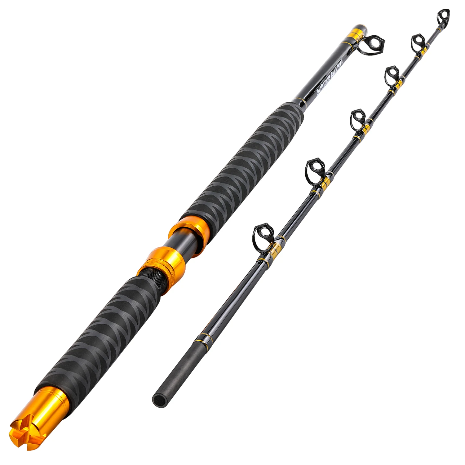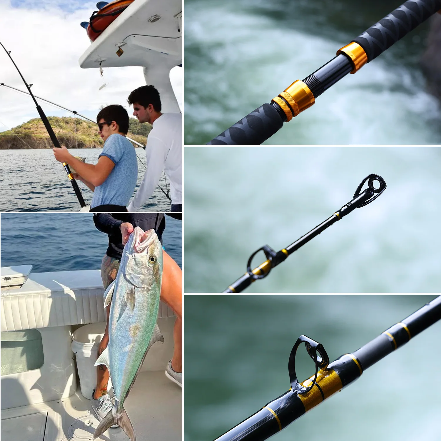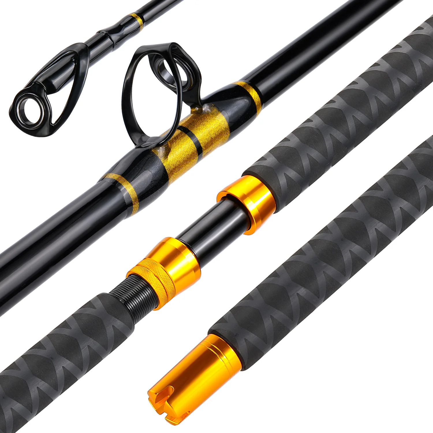 Material: Fibra de vidrio sólida: Si está buscando una pesca de gran caza como atún o amberjack, la fibra de vidrio es el mejor material.Las cañas de pescar de fibra de vidrio pueden tener una acción más lenta y un poco más pesadas, pero son muy efectivas con peces trofeos grandes y son ideales para lanzar señuelos grandes y pesados.Longitud: 6'