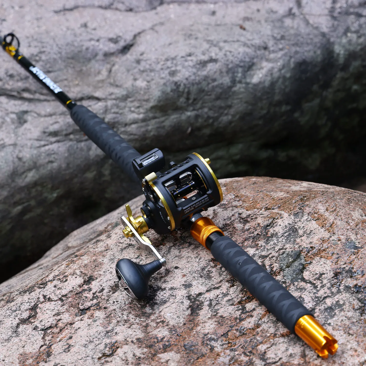 Gran potencia: La potencia es la cantidad de presión que tendrá que aplicar para doblar la varilla.Esta caña de 50 a 80 libras tiene una potencia extra pesada, por lo que podrá soportar pesos pesados y alta presión aplicada por peces grandes como amberjack, atún o muskies.