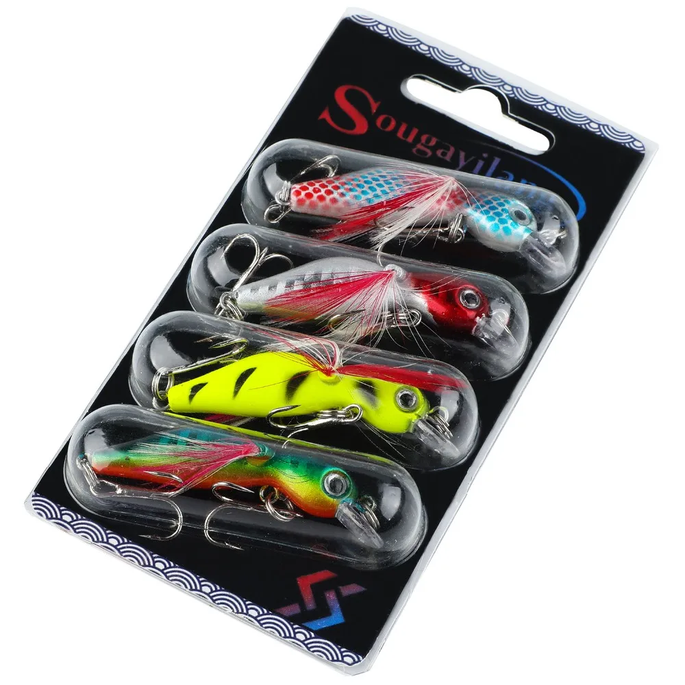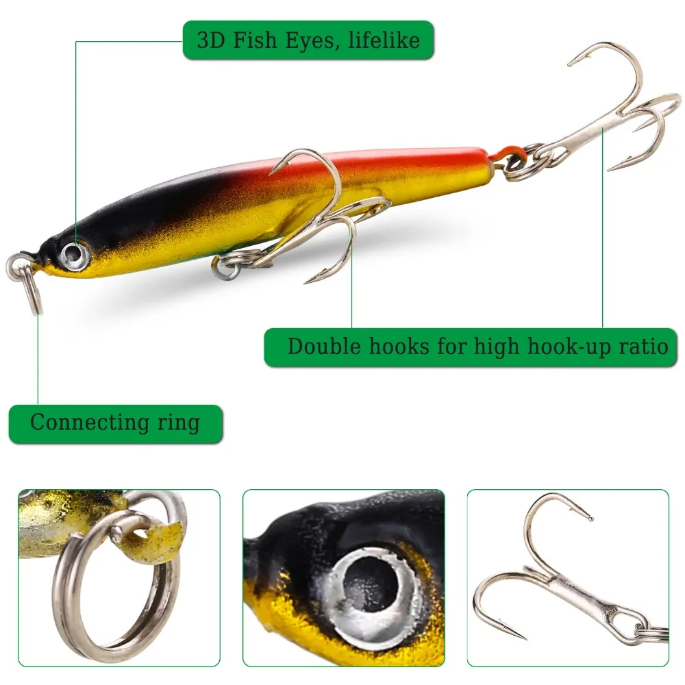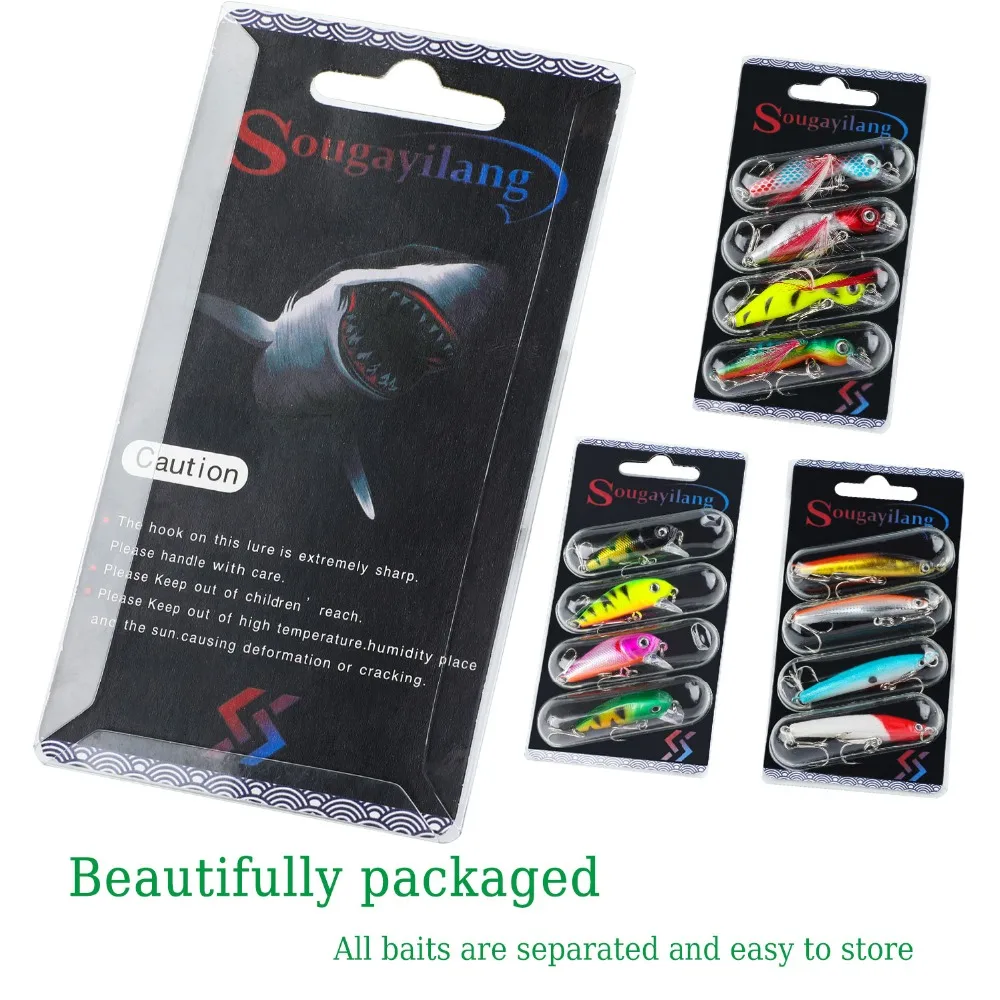Características:2 fuertes#5 anzuelos triples y detalle del cuerpo de alta resolución.El material ABS duradero contribuye a una larga vida útil.Enfocar las bolas desplazadas dentro del cuerpo ayudará a tirarlas.Arrascar con sonido atraerá fuertemente a los peces.Adecuado para diferentes tipos de peces, herramienta maravillosa para los amantes de la pesca.Especificaciones:Estilo: Estilo 1/Estilo 2/Estilo 3 (Opcional)Material: ABSLista de paquetes:Señuelos de pesca de 4 piezas en una tarjeta