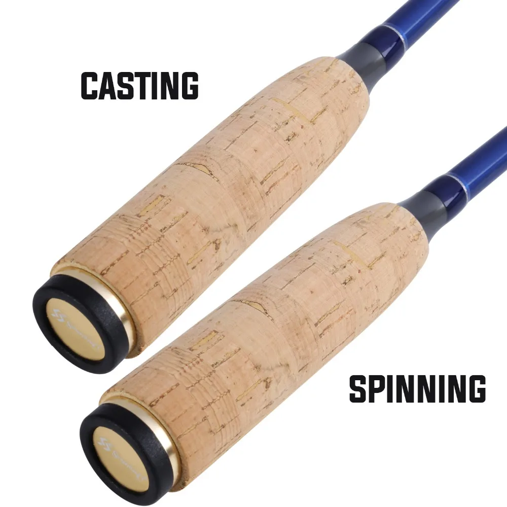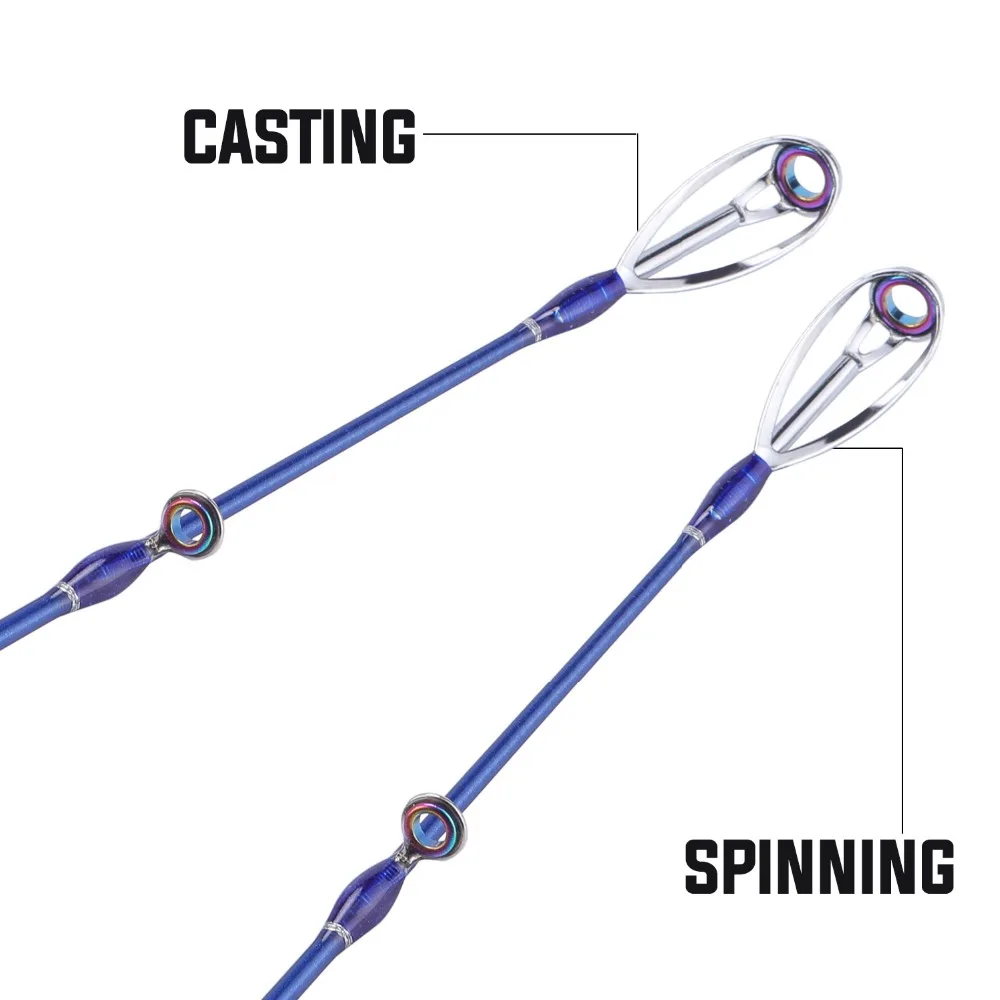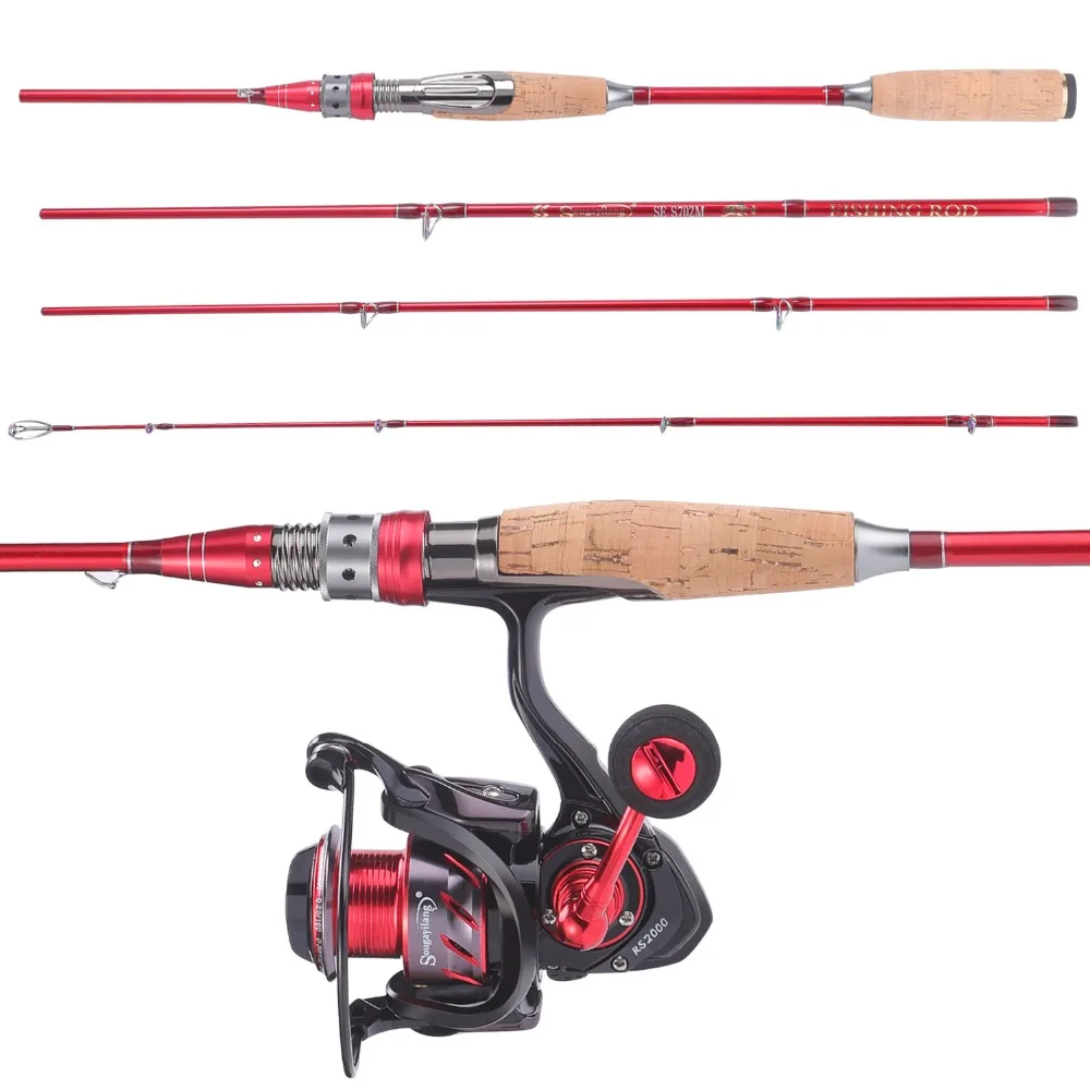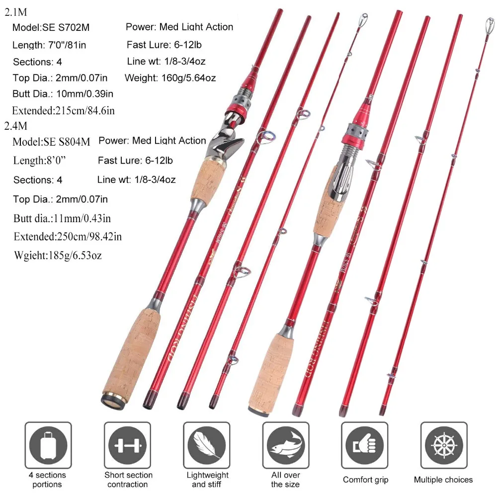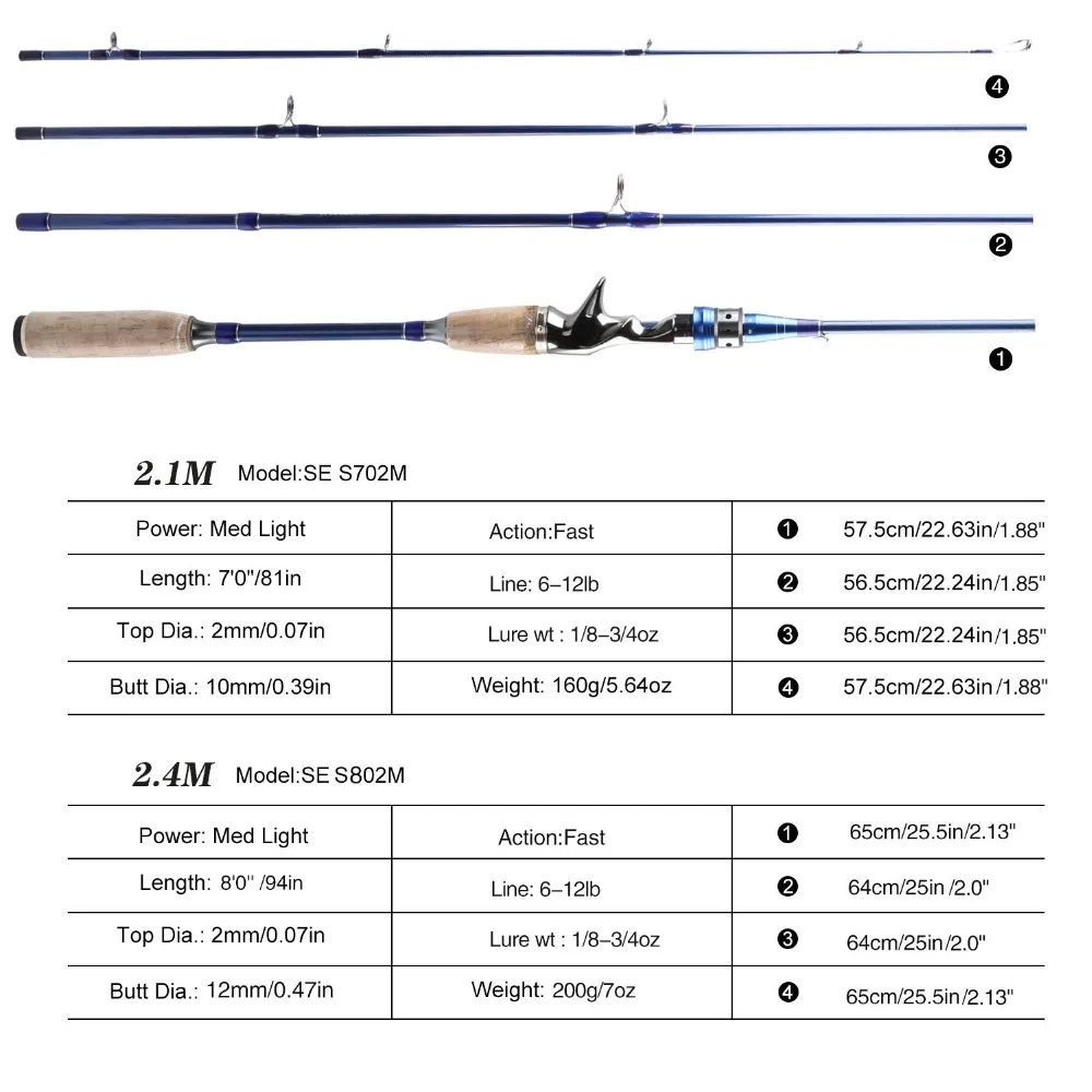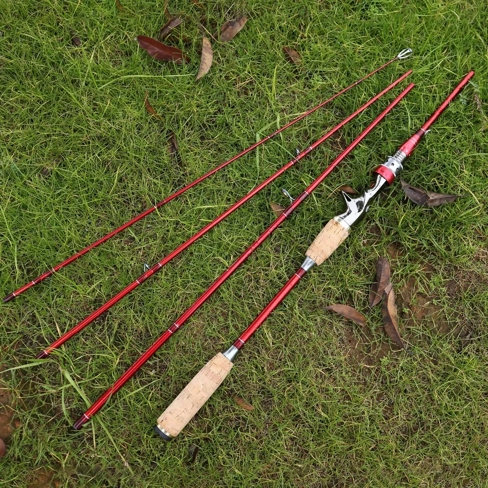 1. Potente, sensible, pero ligero.2. El portacarretes de alta resistencia y durabilidad proporciona una base sólida tanto para girar3. Anillos guía de cerámica de alta calidad, minimizan la fricción de la línea, disipan el calor de manera eficiente, pueden ofrecer moldes suaves más largos que otras guías.4. Mango EVA cómodo y antideslizante para cumplir con el diseño ergonómico y controlar mejor la caña.5. Diseño portátil de 4 secciones: Peso ligero y portátil, cabe fácilmente en el maletero del coche, escotilla de barco o mochila.6. Guías de acero inoxidable con insertos de cerámica para usar con sedal trenzado o mono y proporcionar agua salada aprobada resistente a la corrosión y control de potencia.Detalles del productoColor: Azul RojoSpinning 2,1 M 2,4 MPeso: 160g 200gPeso del señuelo: 6-12LBPeso de Línea: 1/8-3/4ozLista de embalaje1 ud. * caña de pescar