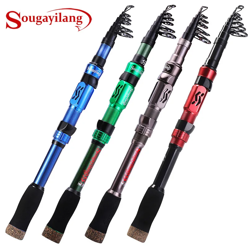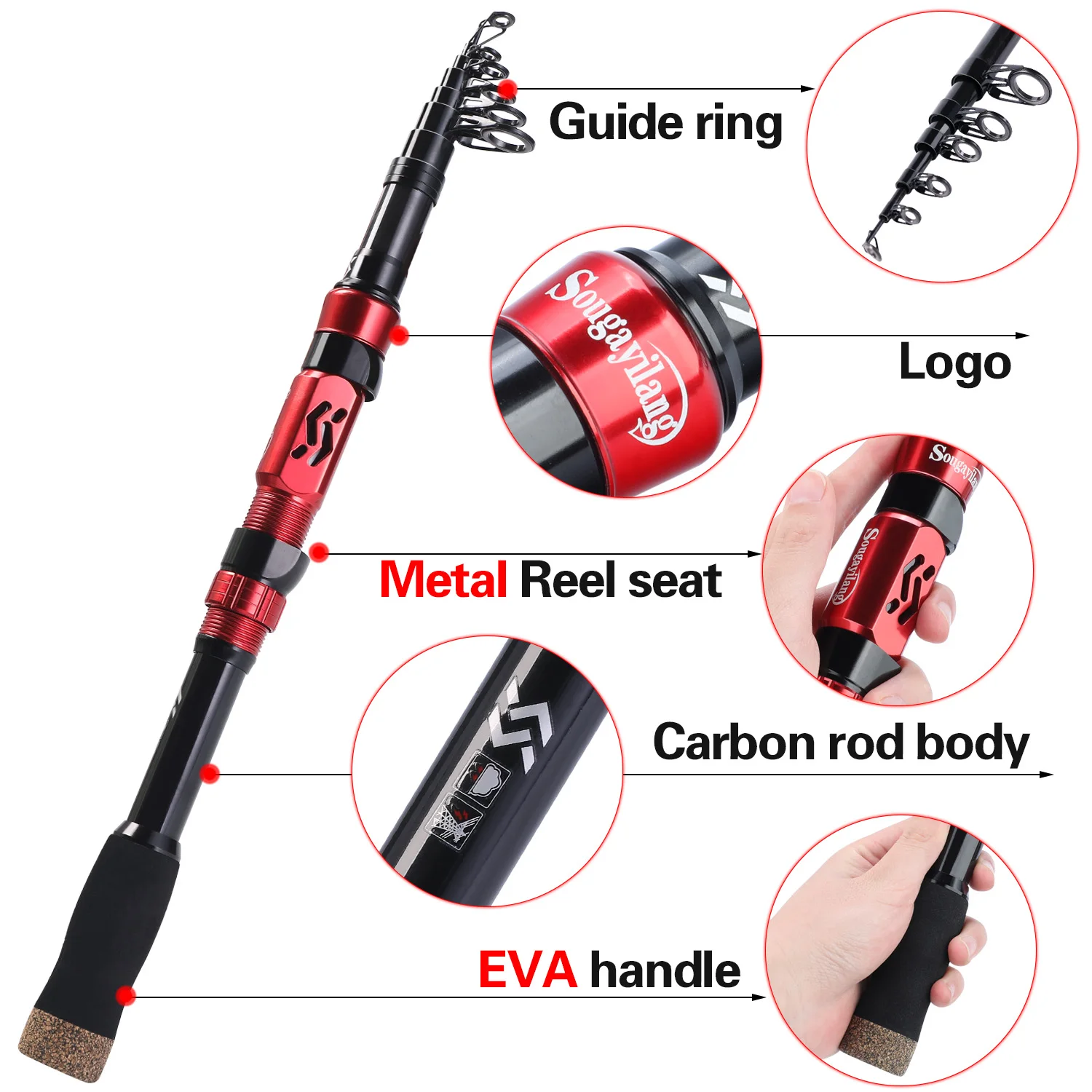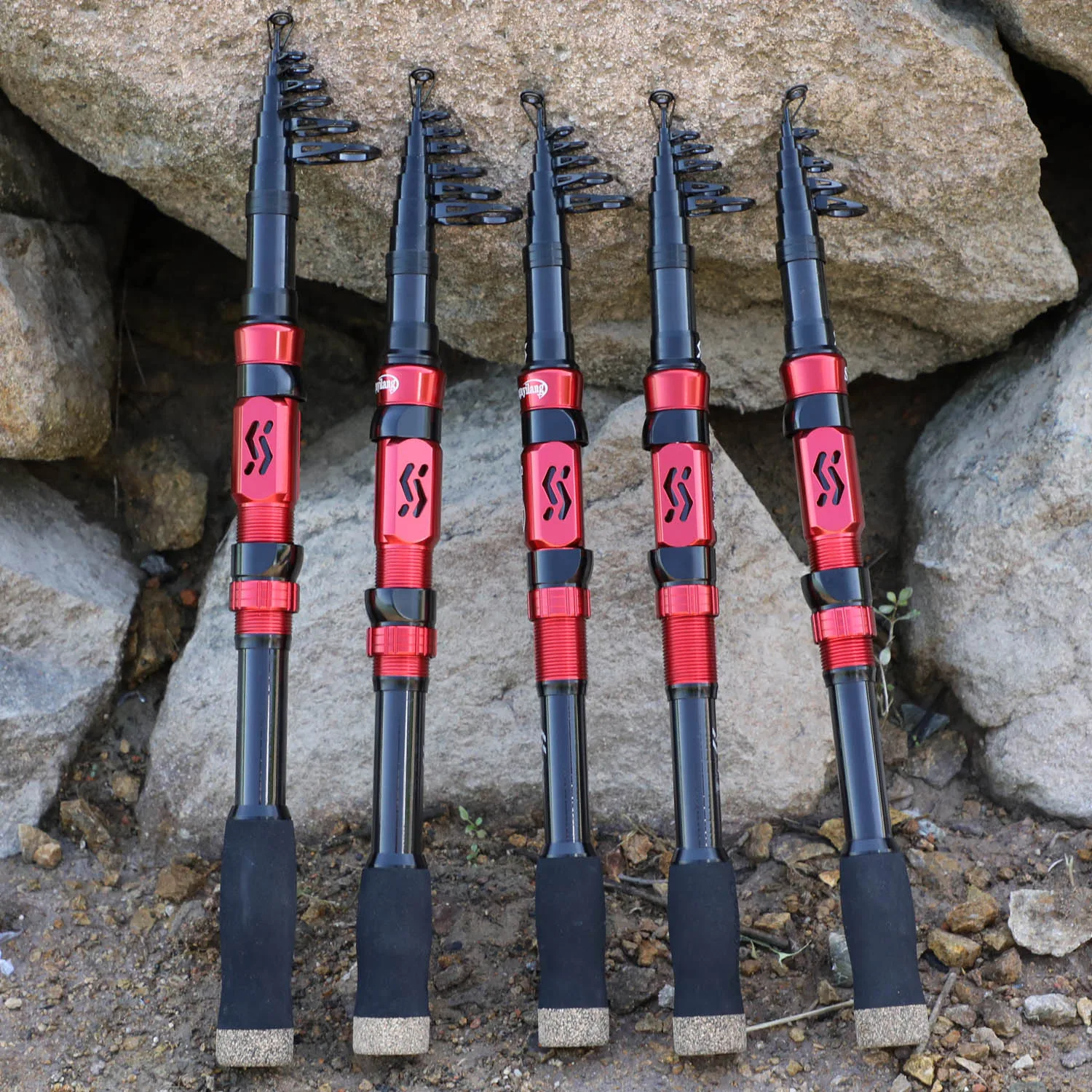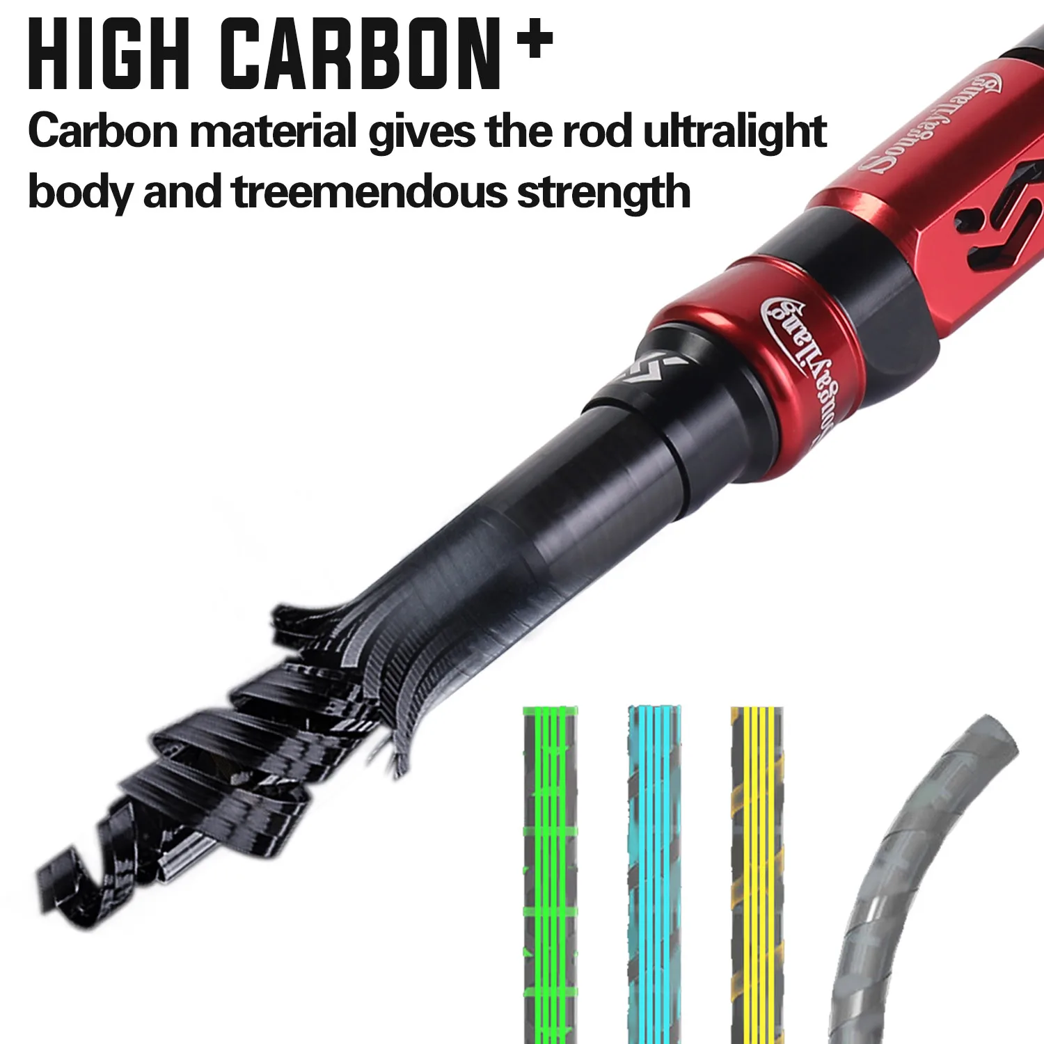 1. Esta caña de pescar está hecha de fibra de carbono, fuerte y duradera.