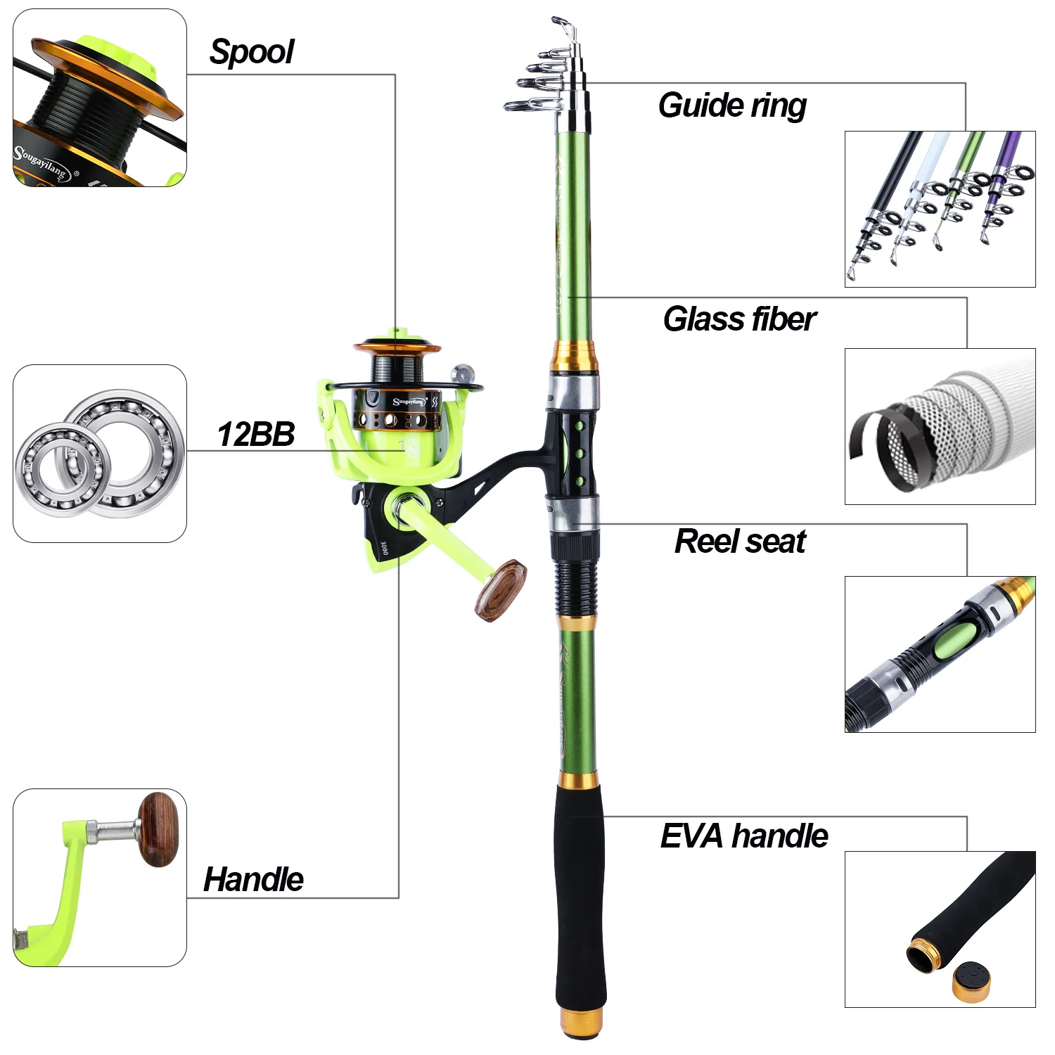 1 caña de pescar + 1 carrete de pesca + hilo de pescar + 1 Juego de accesorios de pesca