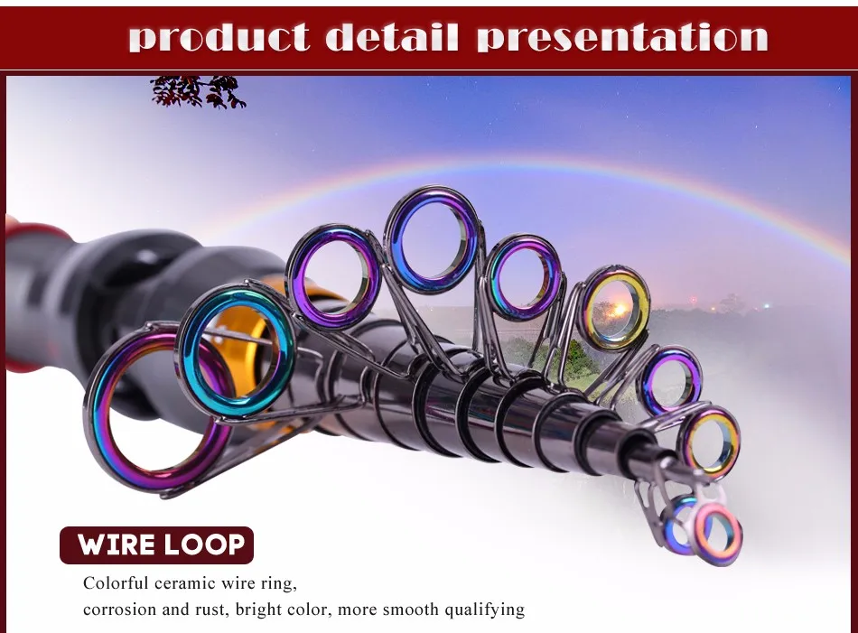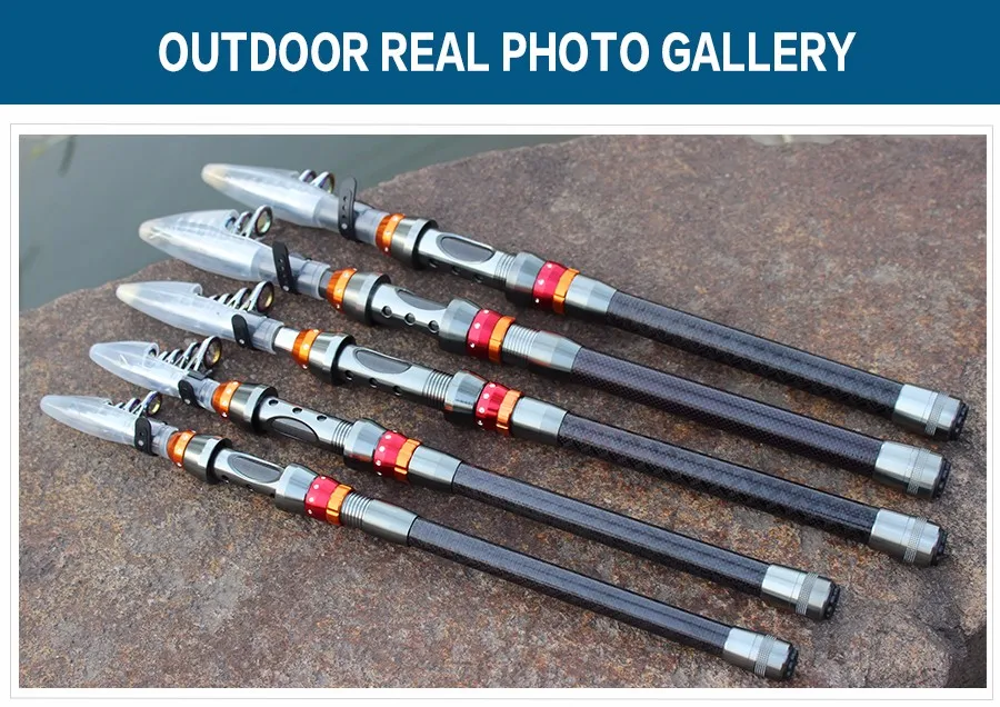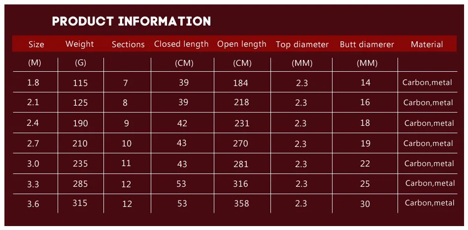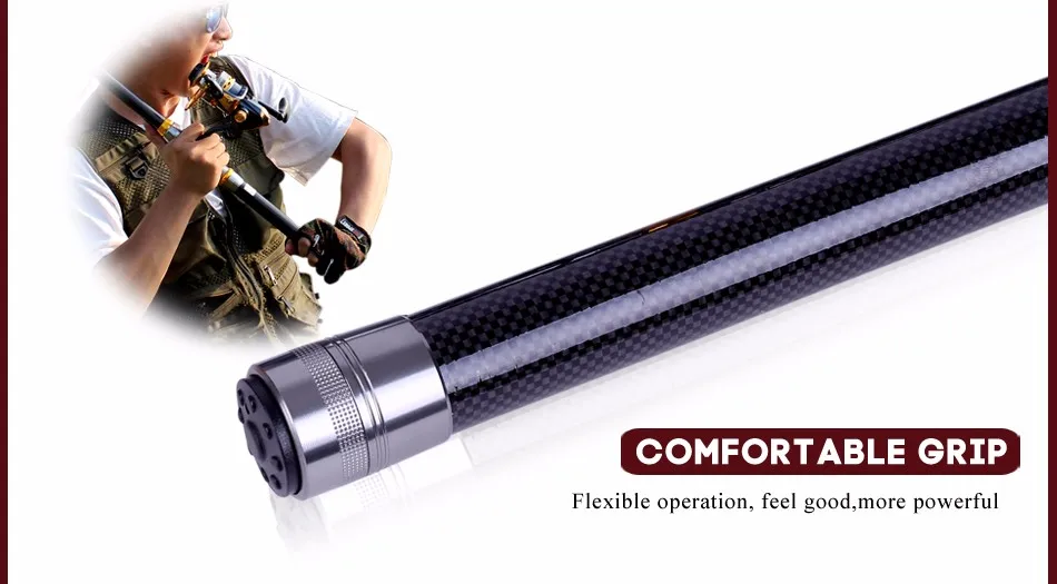 Especificaciones:1.Material: fibra de carbono + aleación2. Peso del señuelo: 10-40g3. Peso de la línea: 10-24lb4. Secciones: 7-125. Longitud cerrada: 39-53cm6, longitud: 1,8 m 2,1 m 2,4 m 2,7 m 3,0 m 3,6 m7. Peso del artículo: aprox. 184-358gEl paquete incluye:1 ud. * caña de pescar