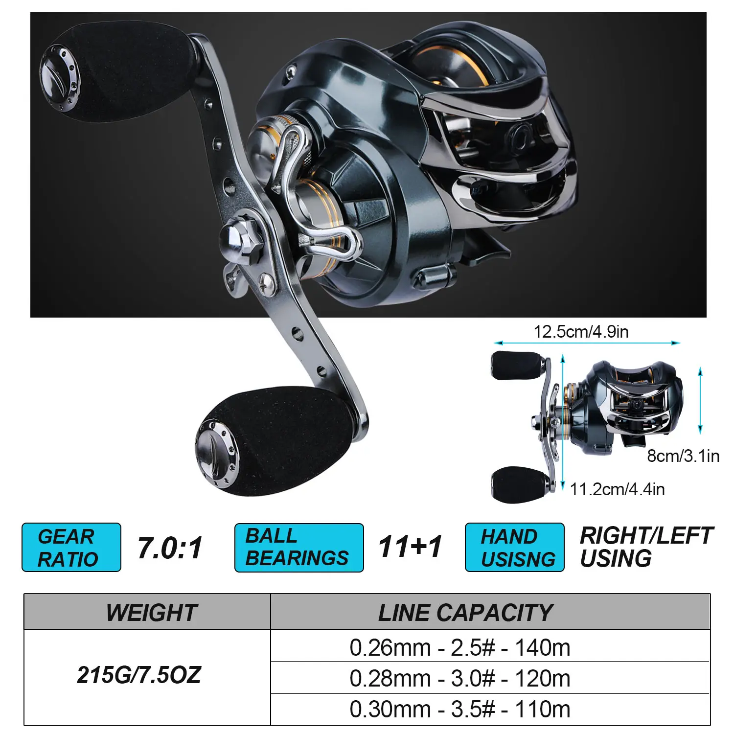 Relación de engranaje de latón 7,0: 1 y bola resistente a la corrosión sin ruido 11 + 1. Muy suave durante la pesca.