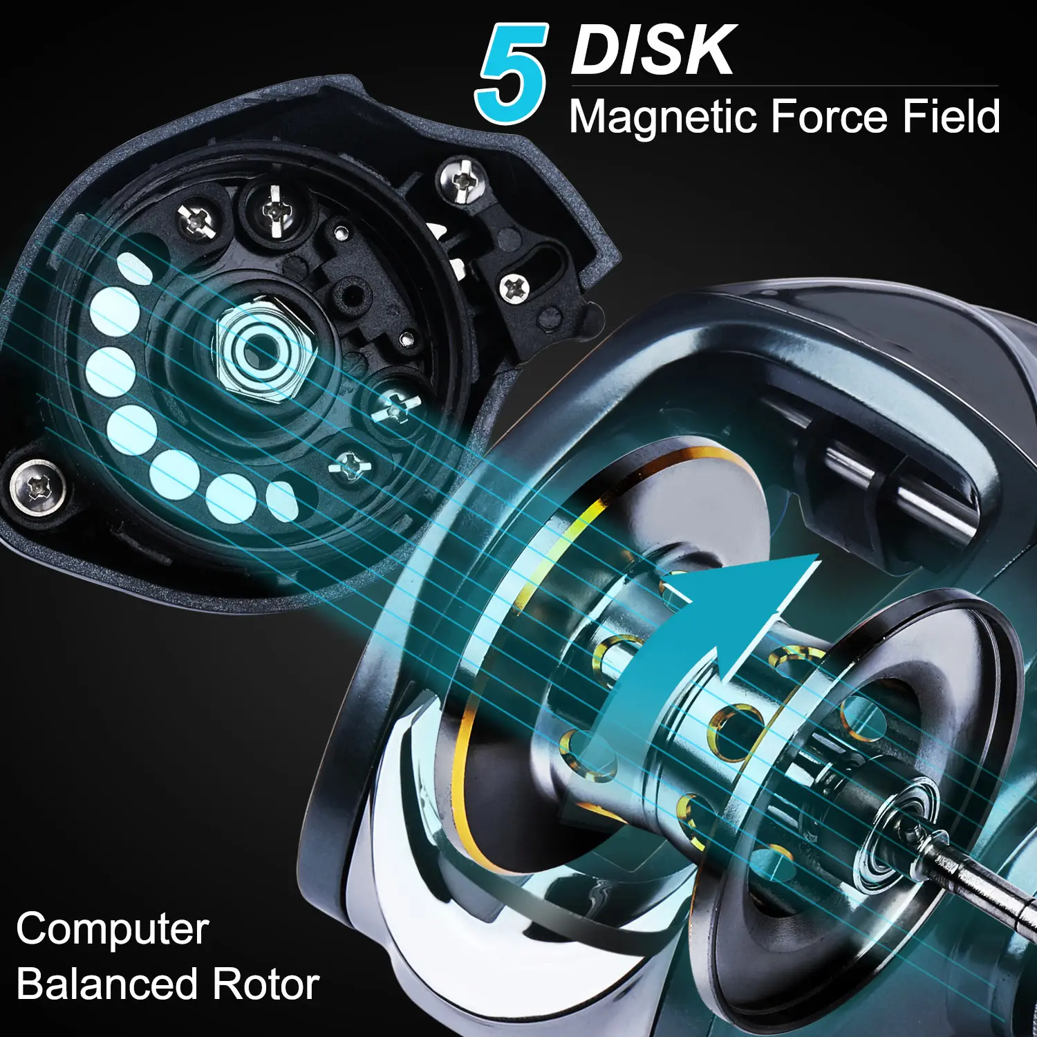 Cinco imanes colocados estratégicamente para optimizar el efecto magnético en el carrete de aluminio portado y un indicador de marcación preciso para el control de retroceso.