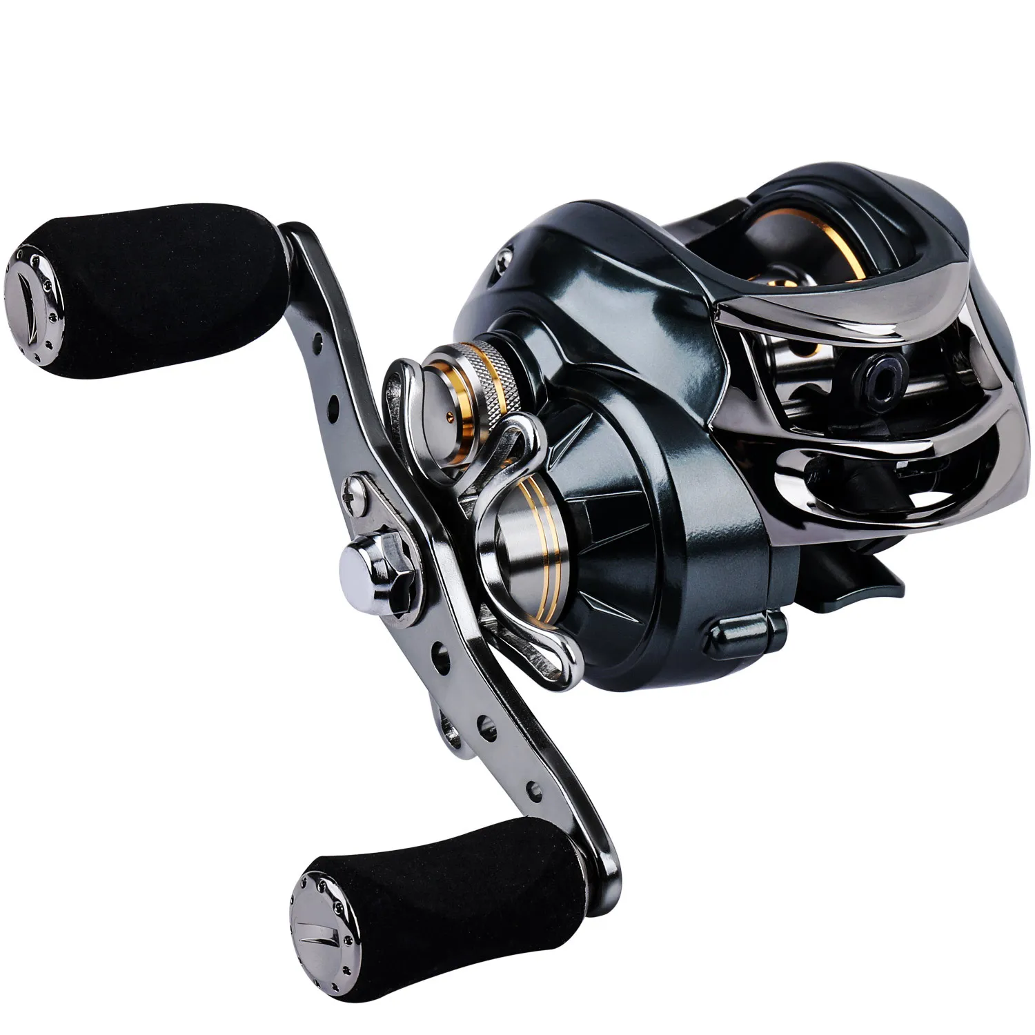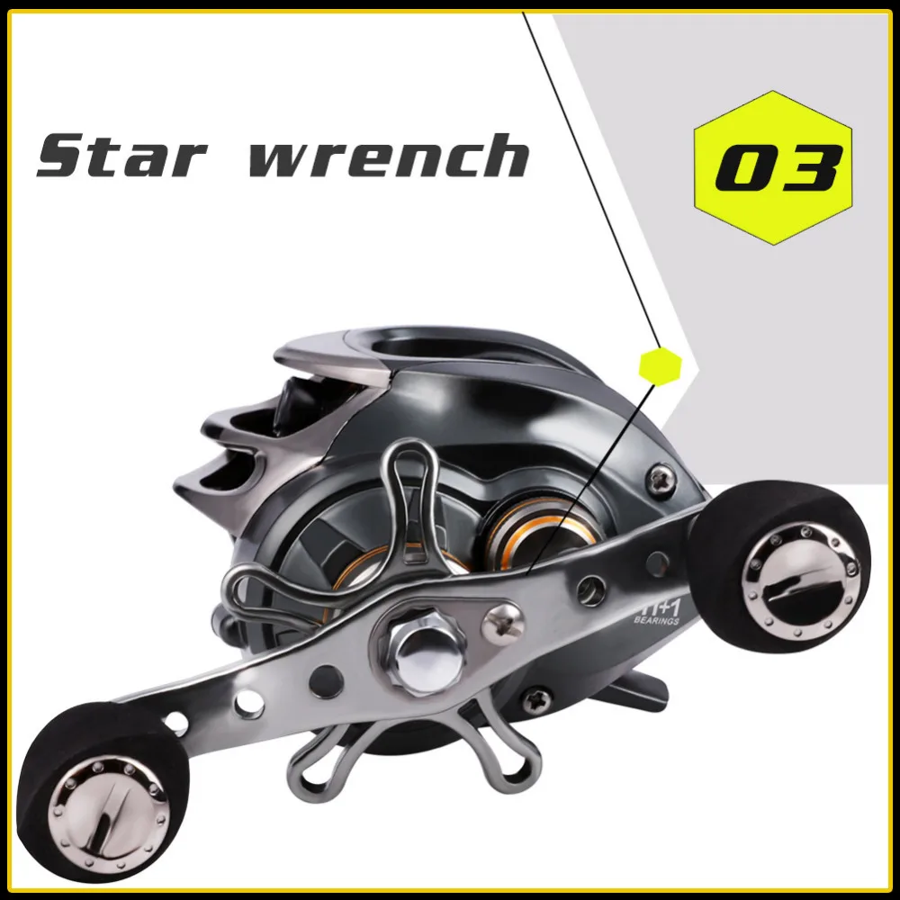 3 arandelas de arrastre de fibra de carbono, haciendo un ajuste fino para impulsar un simple giro del ajuste de arrastre de estrella. El engranaje principal de latón mecanizado de precisión proporciona un funcionamiento suave y una larga vida útil del carrete.