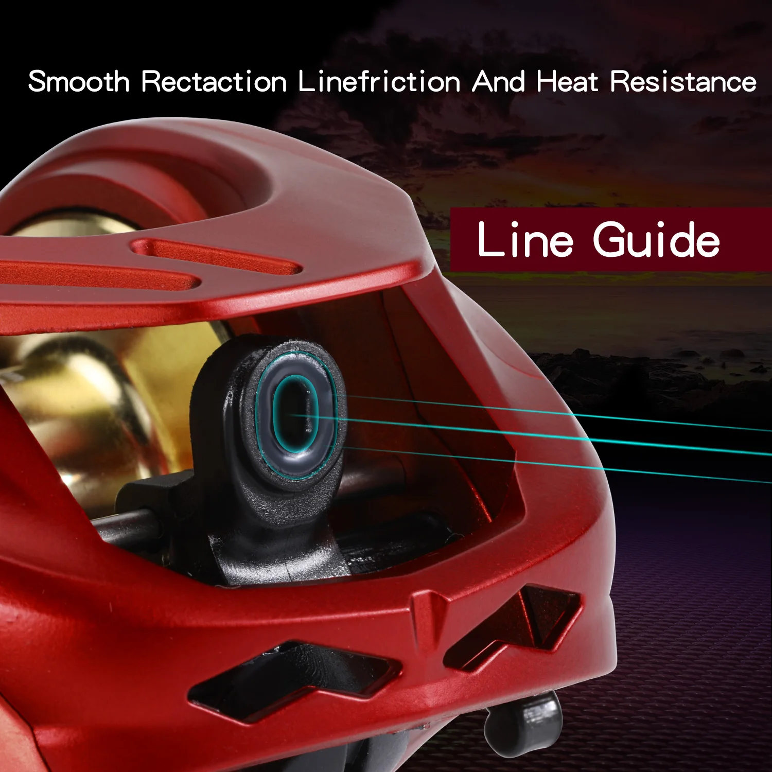 Magnetic Brake System - With magnet beans in the magnetic brake system, the baitcasting reel provides a stabler and smoother operation for complete cast control. And funnel-shaped line guide greatly reduces line friction, giving you super long casts.
