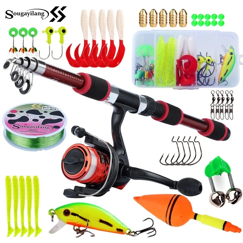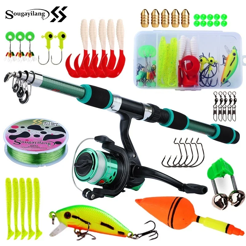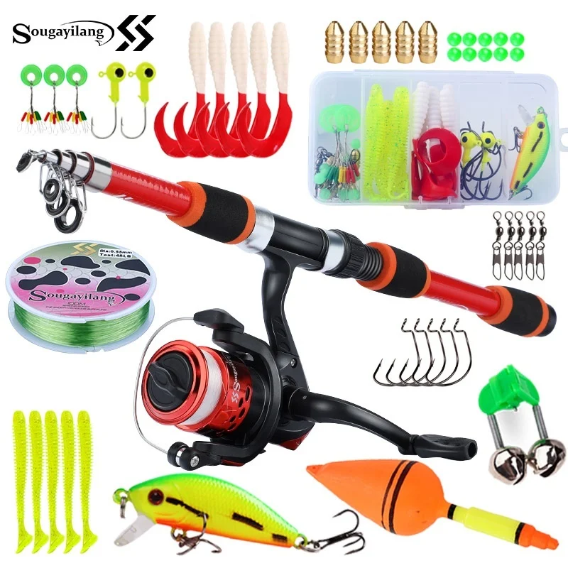Juego de cañas de pescar para niños Sougayilang, kits completos con caña de pescar telescópica y carrete giratorio, cebos, ganchos, juego de cañas de viaje de agua salada