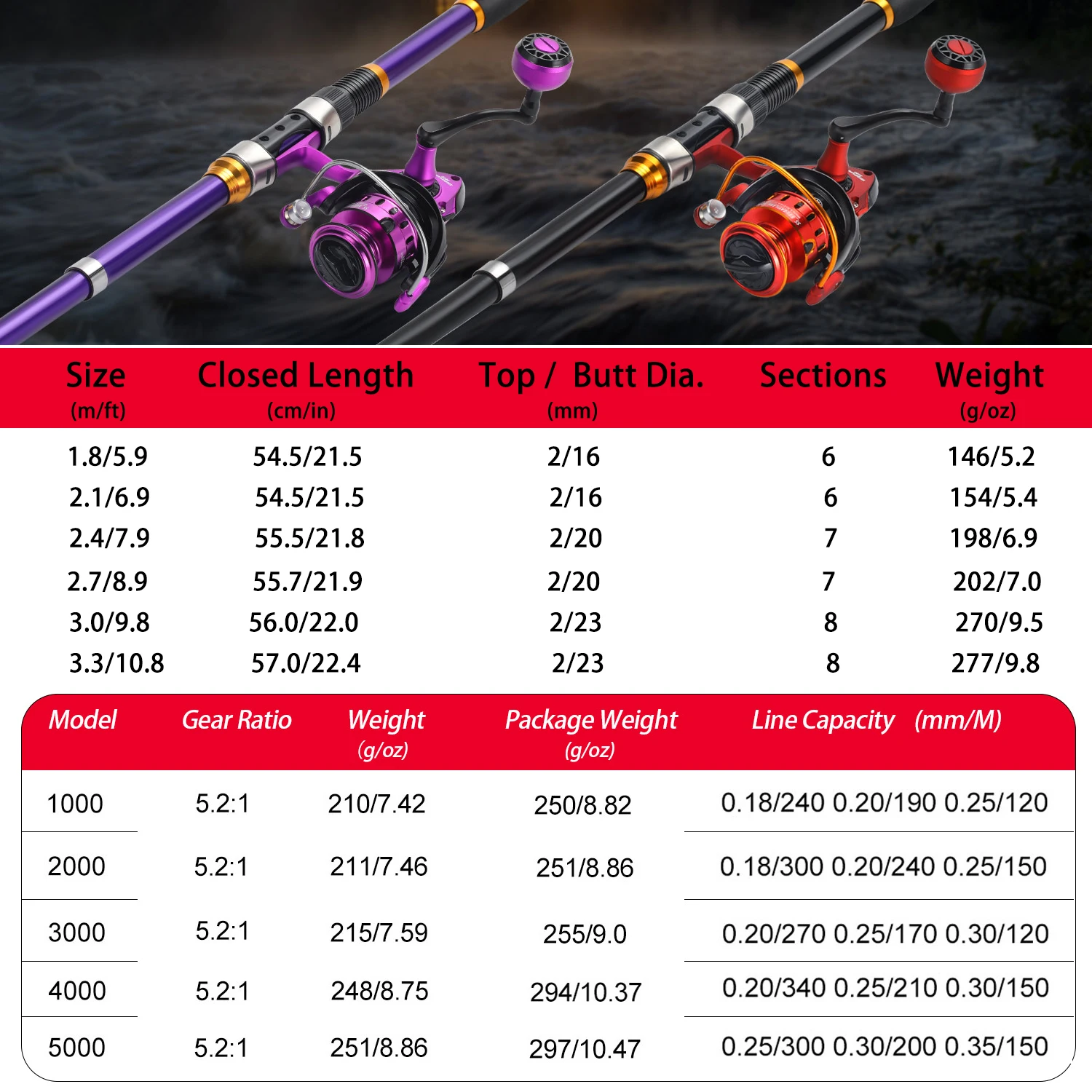 Con un rango de longitud de 1,8-3,3 m, este combo de caña de pescar es perfecto para diversos escenarios de pesca, desde pequeños arroyos hasta grandes lagos.