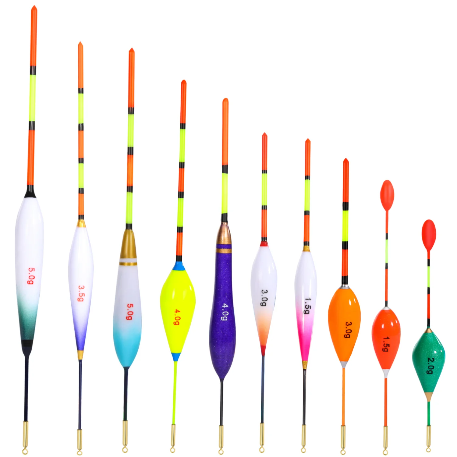 Este juego de 10 piezas proporciona todo lo que necesita para una configuración integral de flotadores de pesca.