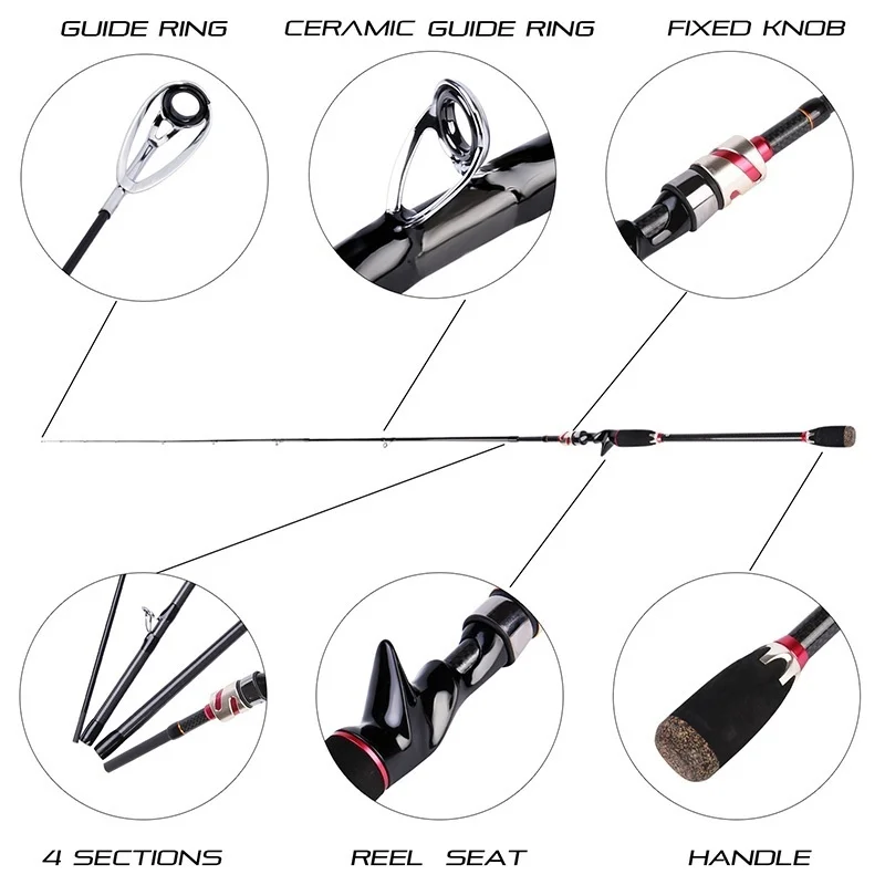 2.El diseño de caña de pescar de 4 piezas de viaje de 4 piezas la hace más portátil.Nota: no fuerce los espacios en blanco de la varilla para cerrar este espacio, ya que podría dañar la varilla.