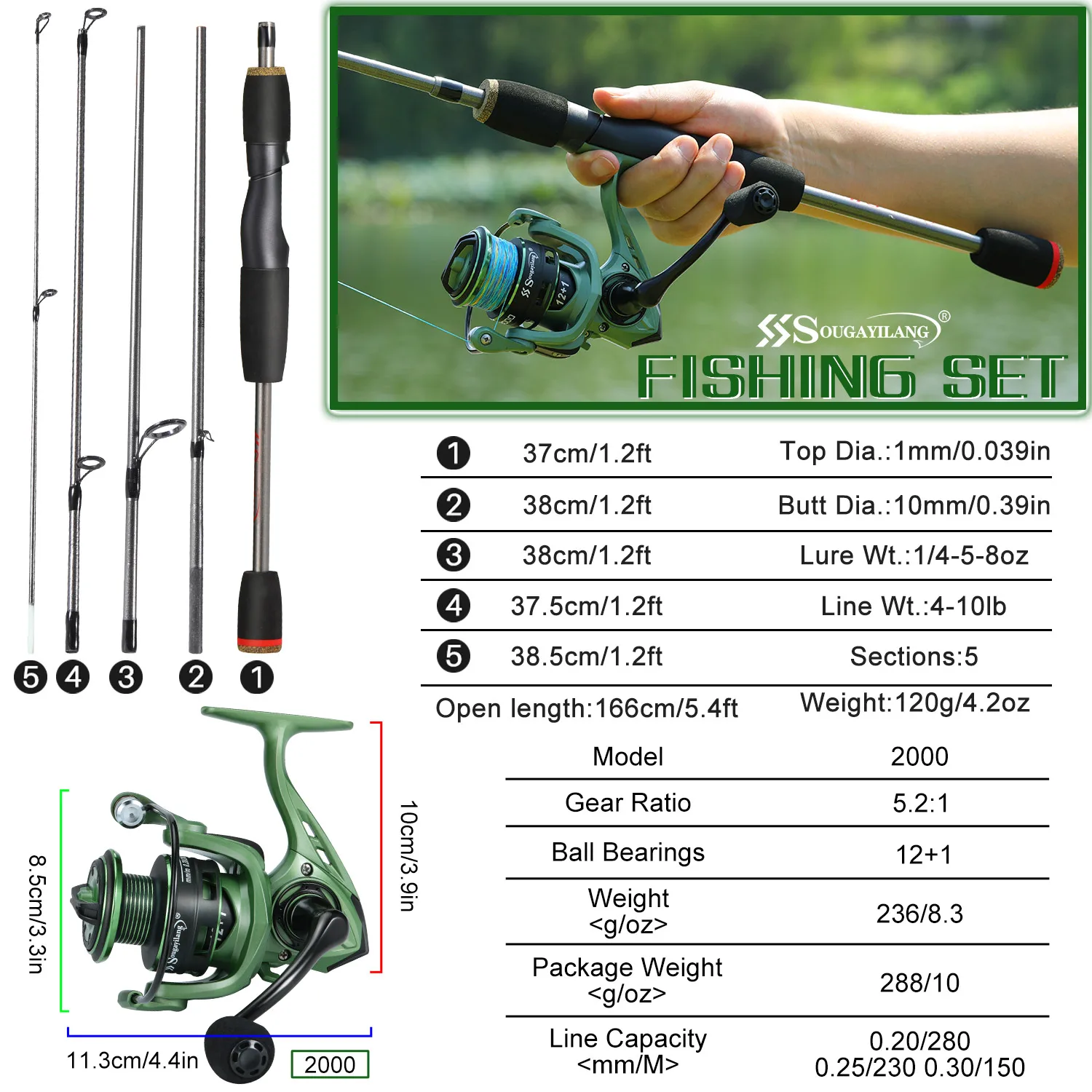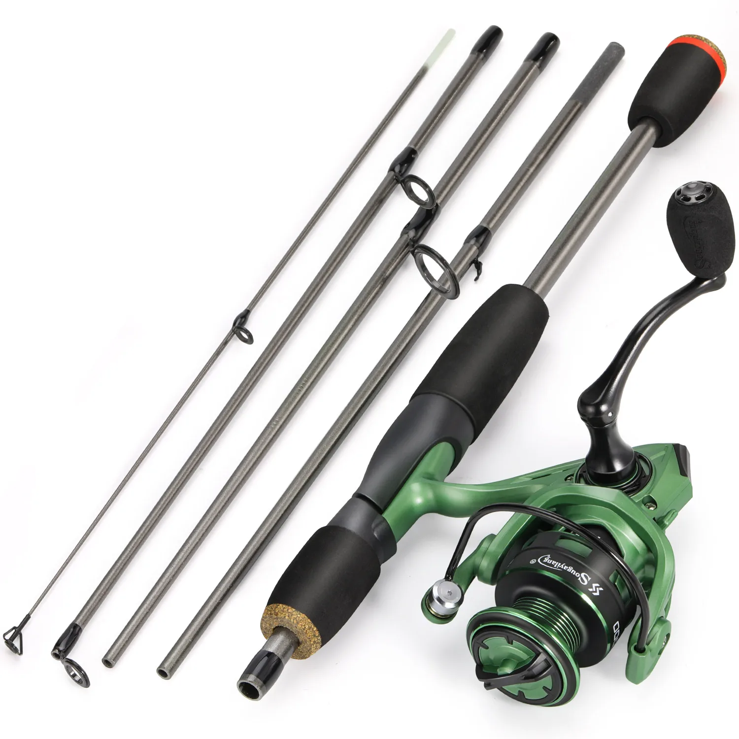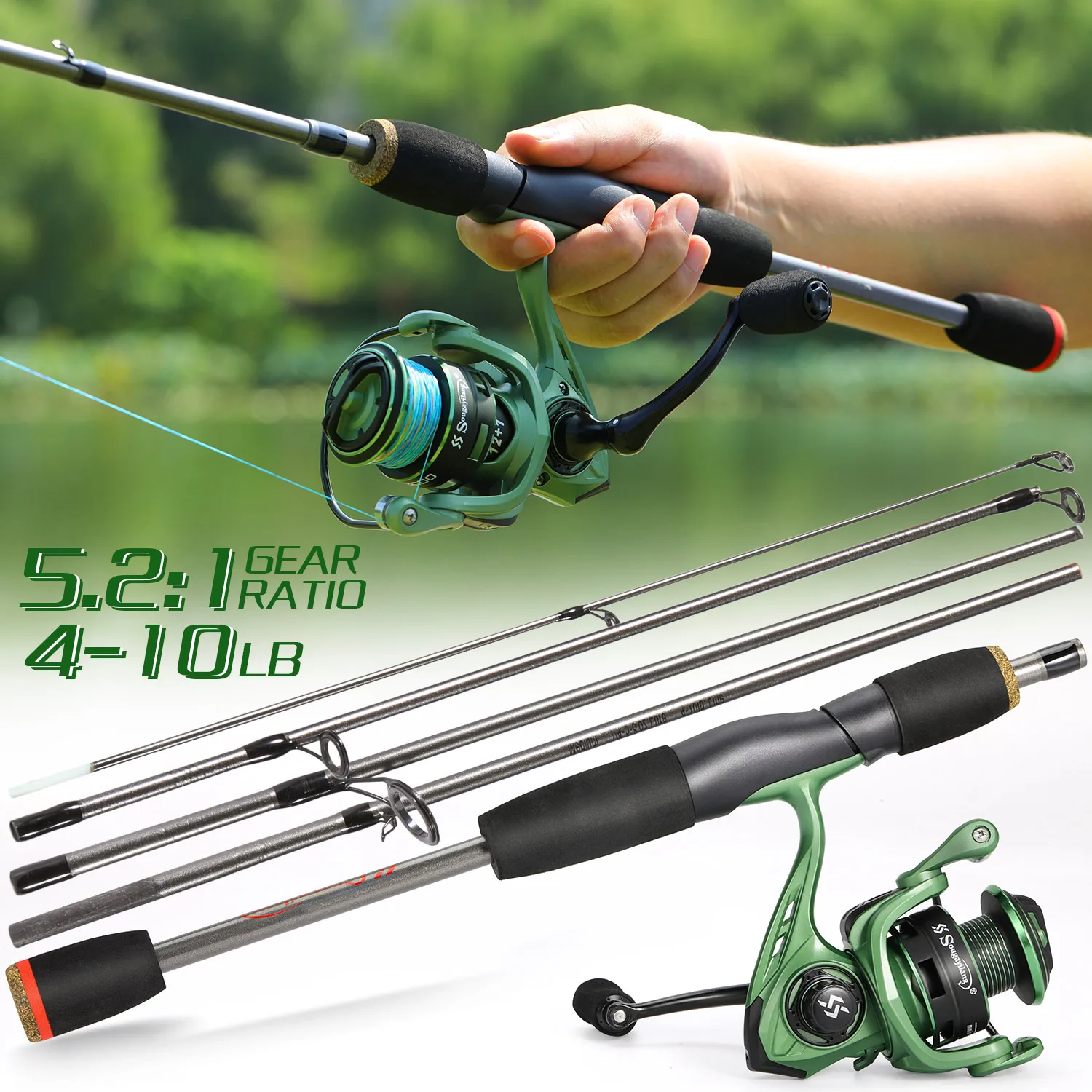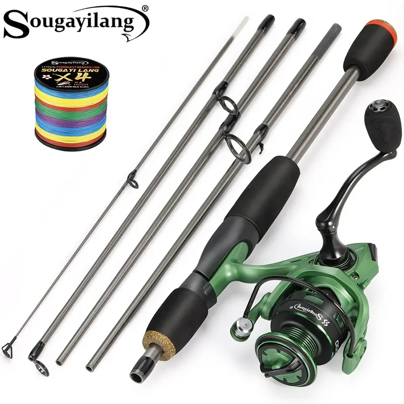 Juego de pesca giratoria Sougayilang, caña de pescar de fibra de carbono de 5 secciones de 1,7 m y carrete de pesca 5,2: 1 12 + 11BB con línea de pesca de 100M