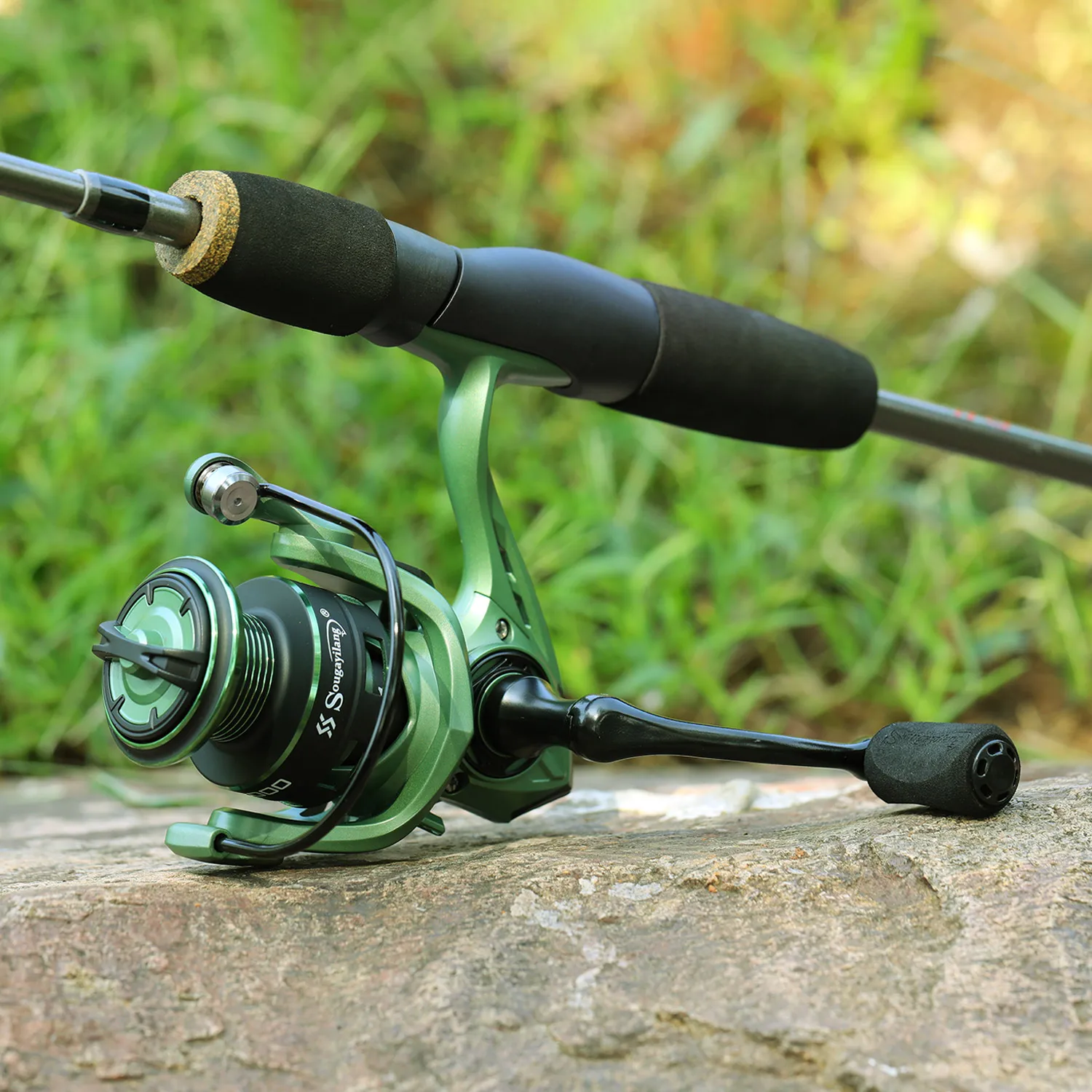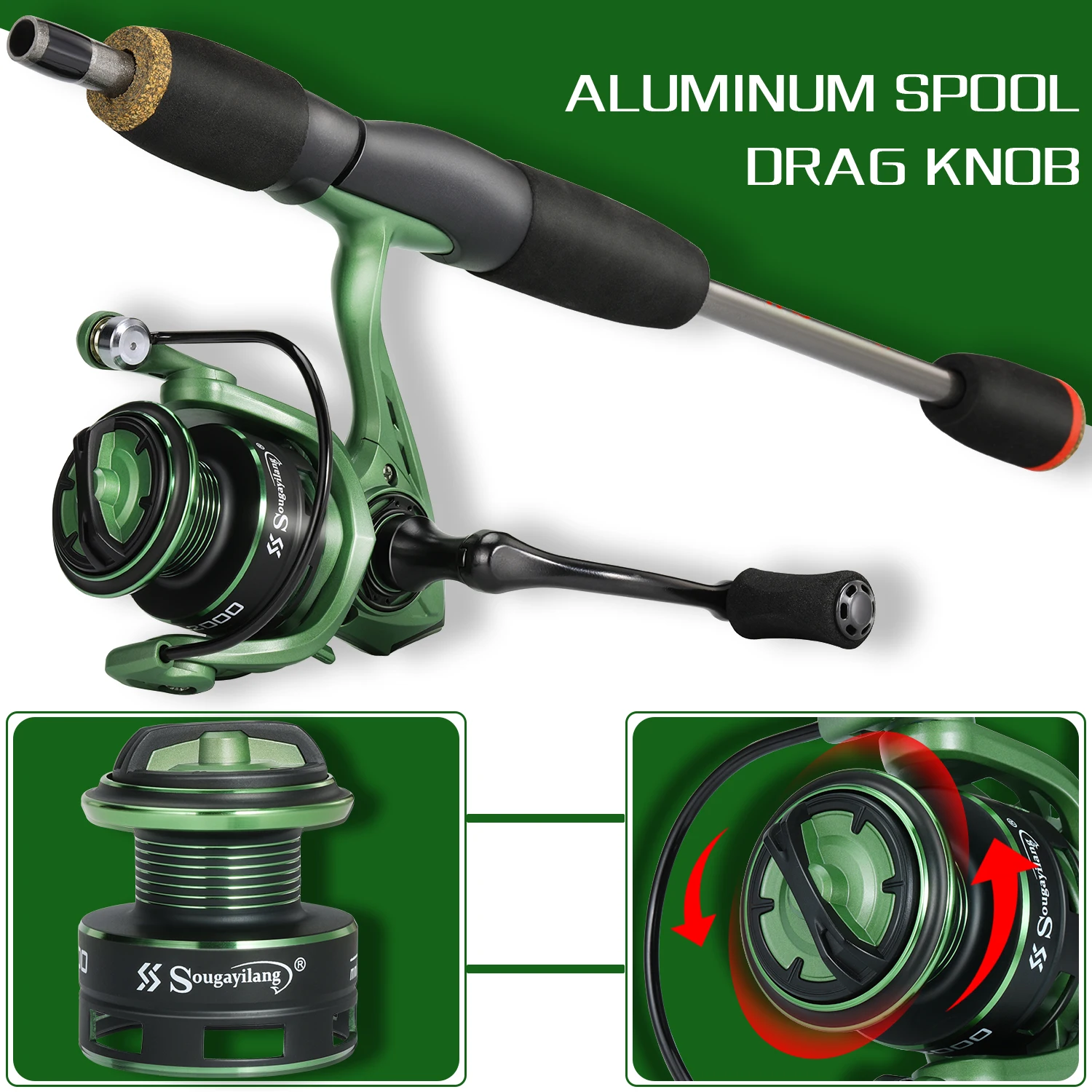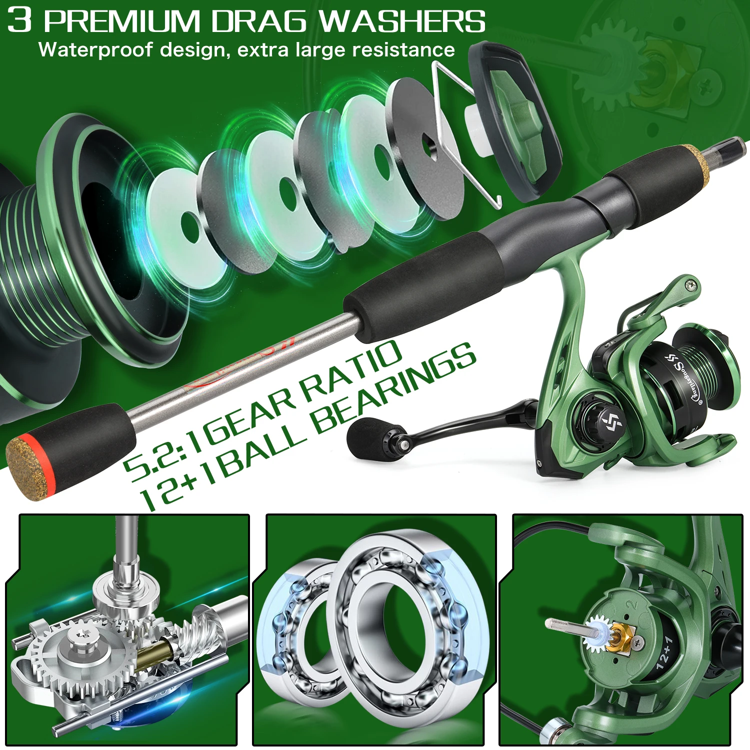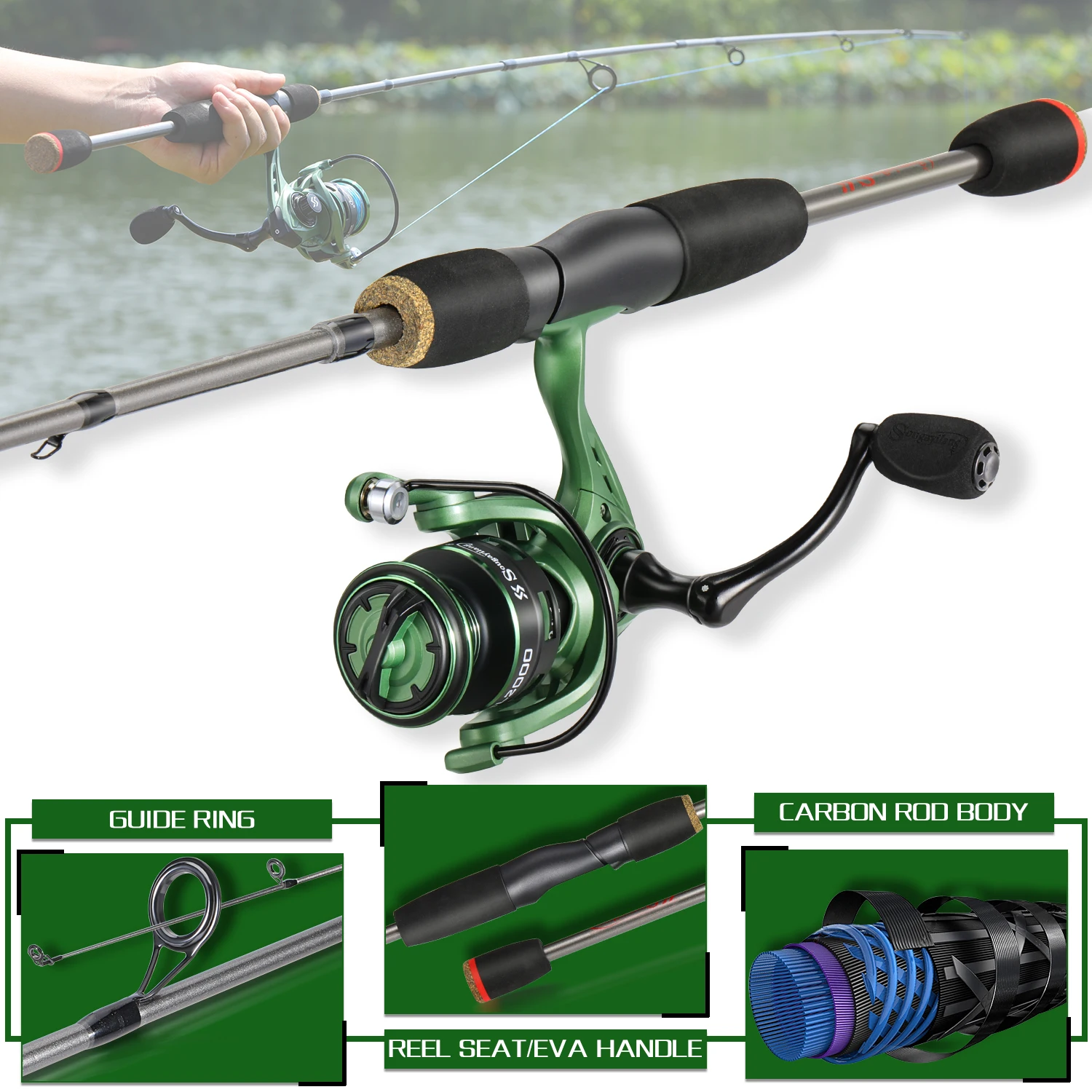 Juego de pesca giratoria Sougayilang, caña de pescar de fibra de carbono de 5 secciones de 1,7 m y carrete de pesca 5,2: 1 12 + 11BB con línea de pesca de 100M