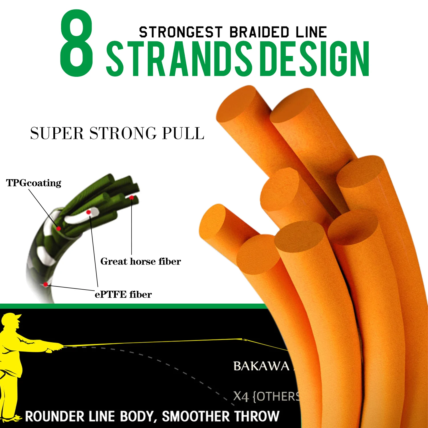 5.Estructura multifilamento súper trenzada X8: alta resistencia y alta tenacidad, buena resistencia al desgaste, baja ductilidad, suave y duradera, gran durabilidad, adecuada para uso a largo plazo.