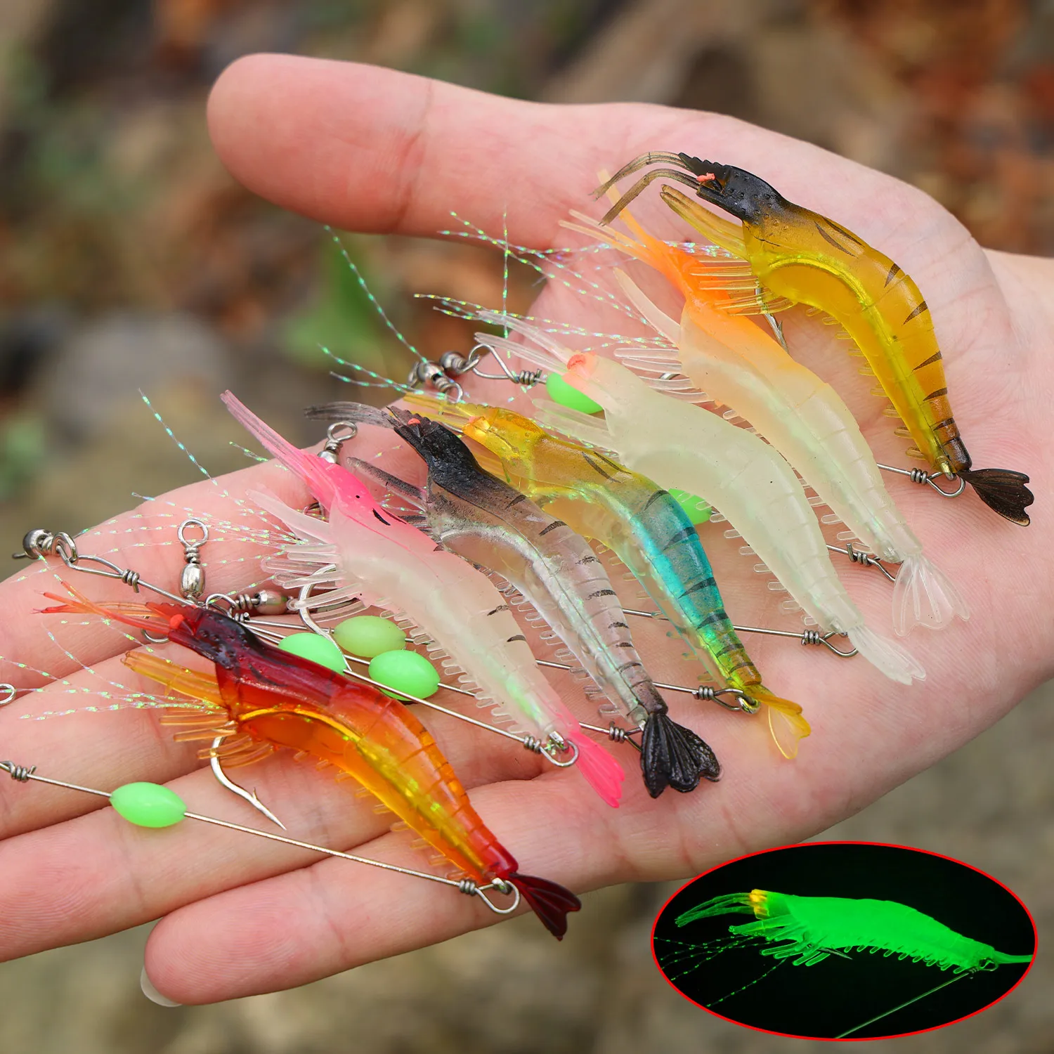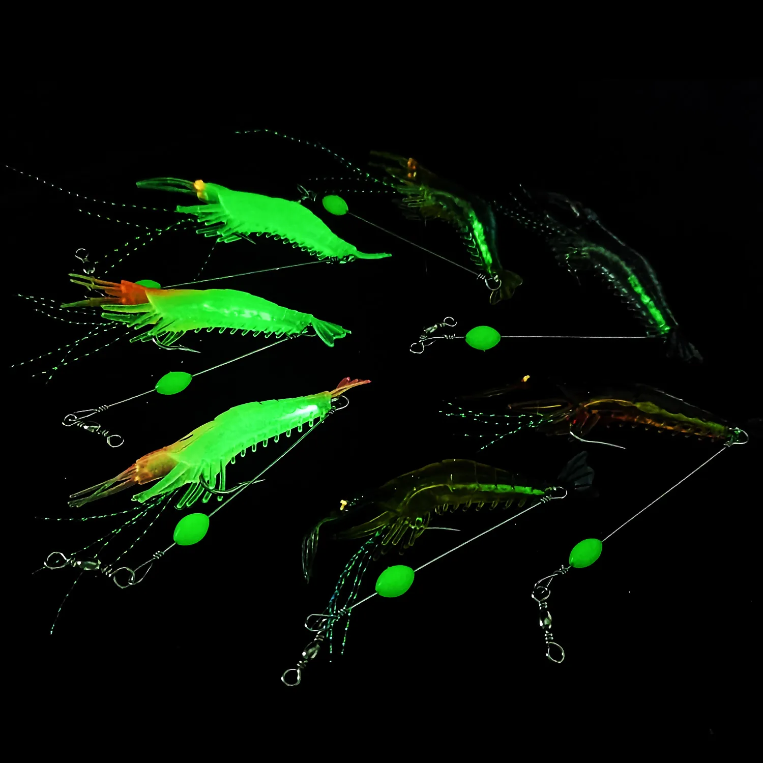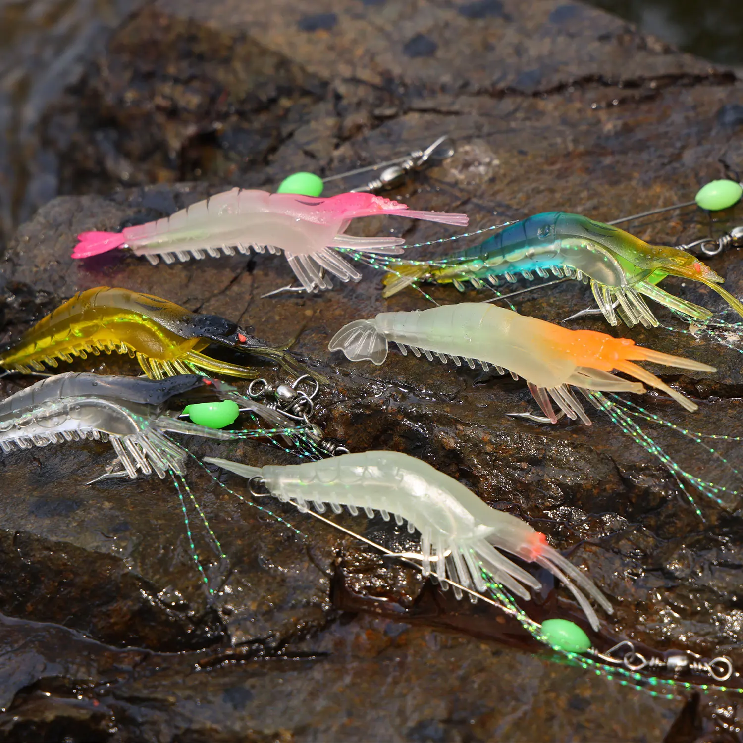 (1) El juego de señuelos de camarón suave tiene material fluorescente colocado en el anzuelo interior, bueno para la pesca nocturna.Las cuentas luminosas realzan el efecto de pesca nocturna.