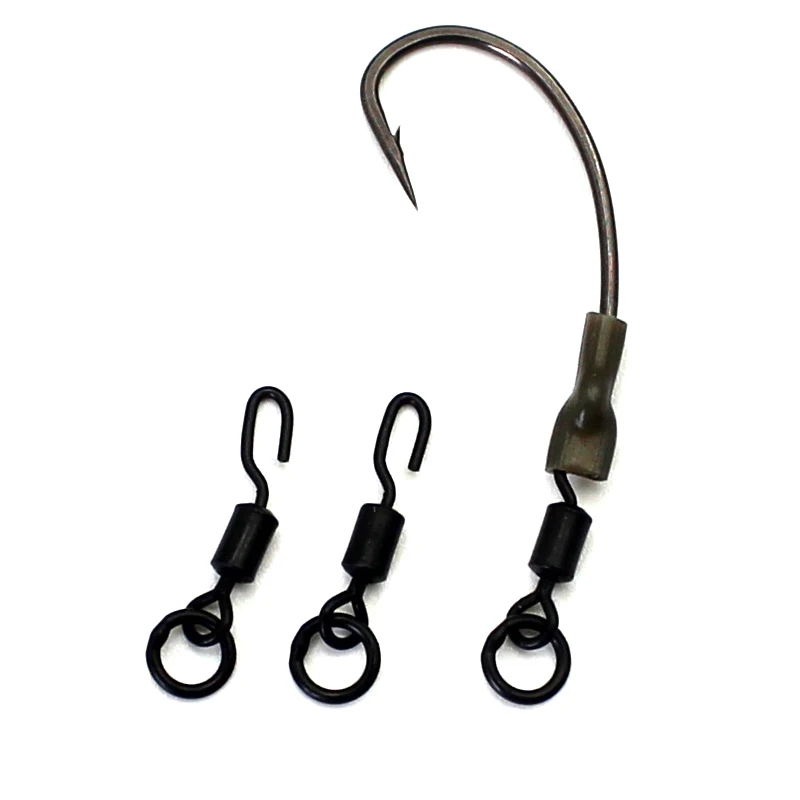 Giratorios de anillo de cambio rápido diseñados para hacer plataformas giratorias (Ronnie Rigs) giratorios especialmente diseñados para hacer el cambio de ganchos más rápido y fácil que nunca. Tubo retráctil necesario para cubrir el enlace de conexión para ayudar a mantener el gancho fijado en el ángulo elegido. El paquete incluye: 20 unids/bolsa