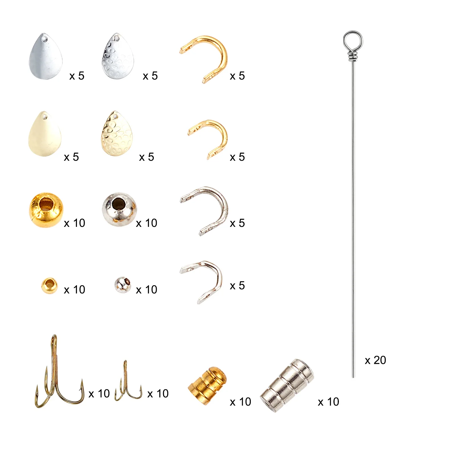 Cantidad:140 piezasConjunto todo en uno.Este surtido contiene 20 ejes, 20 cuchillas, 20 horquillas, 20 cuerpos de señuelo, 20 anzuelos triples, 40 cuentas. Ver imagen para tamaños detallados,Todos los componentes, excepto el alambre giratorio, vienen en dos tamaños para satisfacer sus diferentes necesidades de pesca.