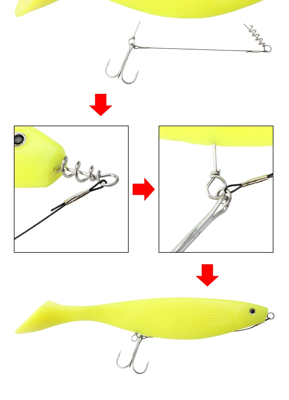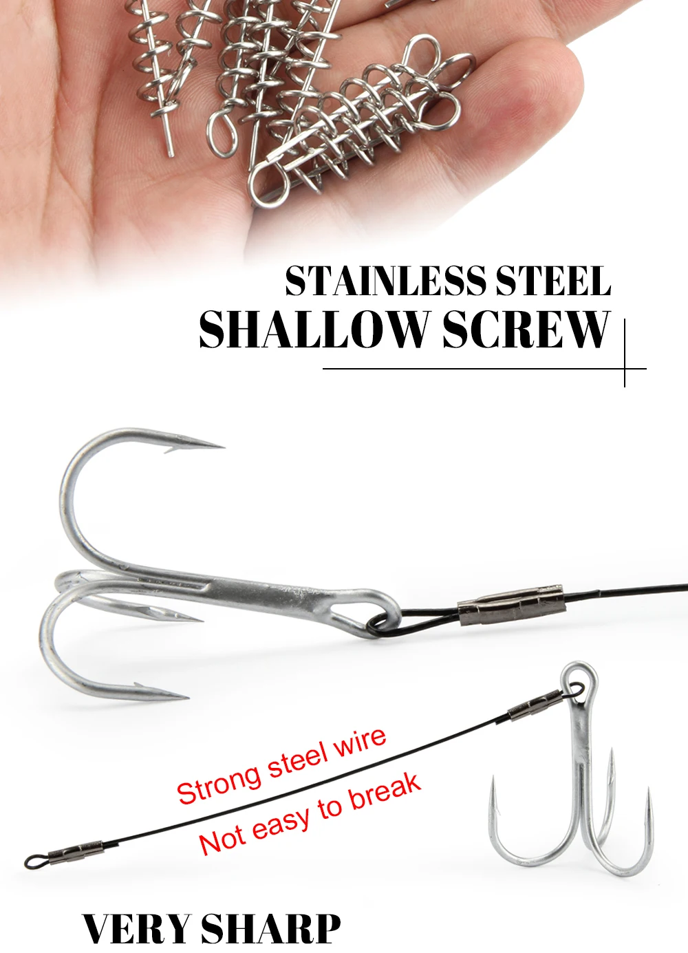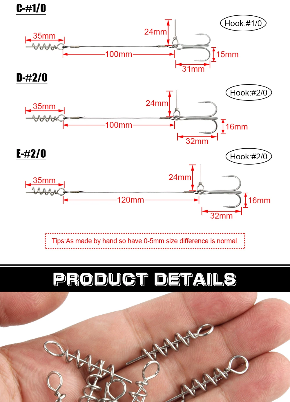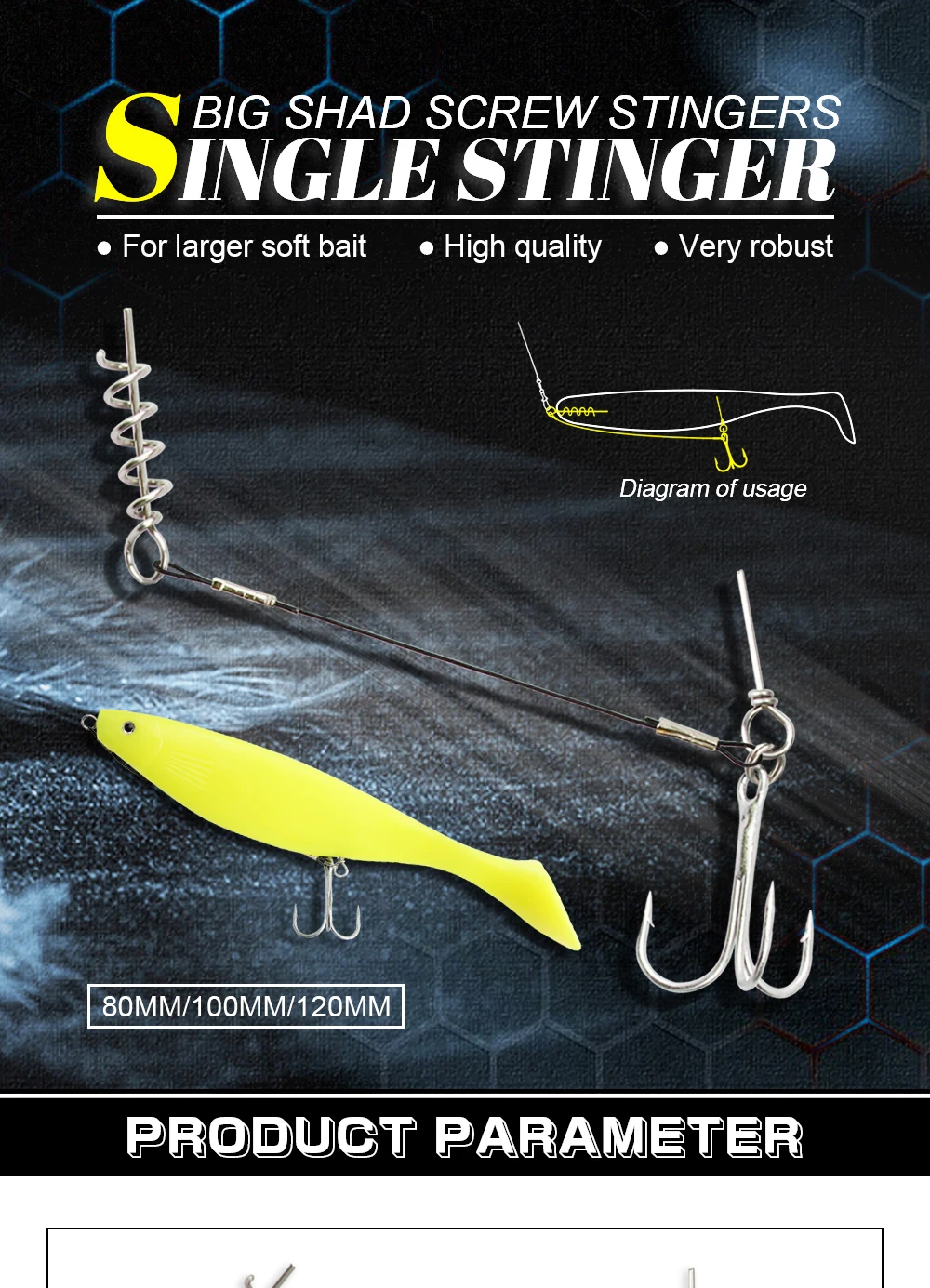 Líderes con sacacorchos que facilitan la instalación precisa en el señuelo blando.3 tamaño 80mm/100mm/120mm, anzuelo triple #1 #1/0 #2/0 para señuelos blandos grandes, Y tres tamaños de anzuelos triples, que garantizan un juego de anzuelos efectivo.