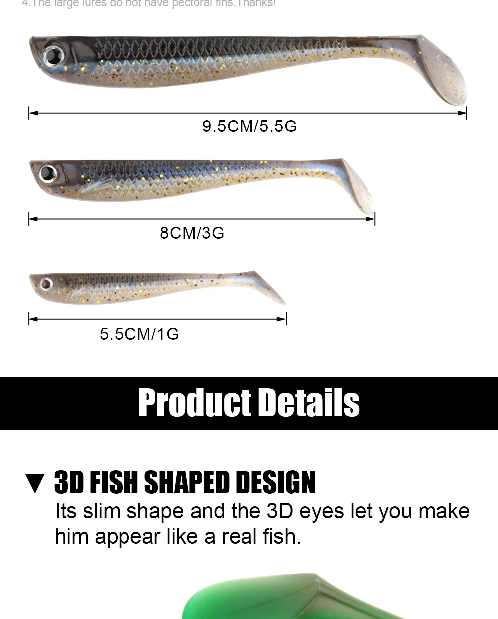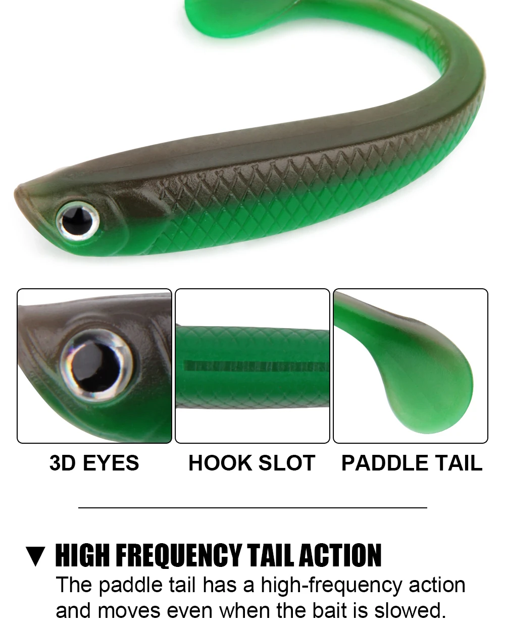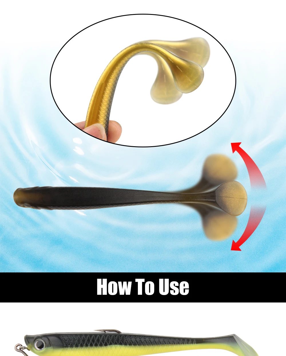 Se puede utilizar como un remolque o aparejado con un jighead. Su gran cola remada y su construcción de plástico de alta calidad permiten que la cola cobre vida incluso a velocidades lentas.
