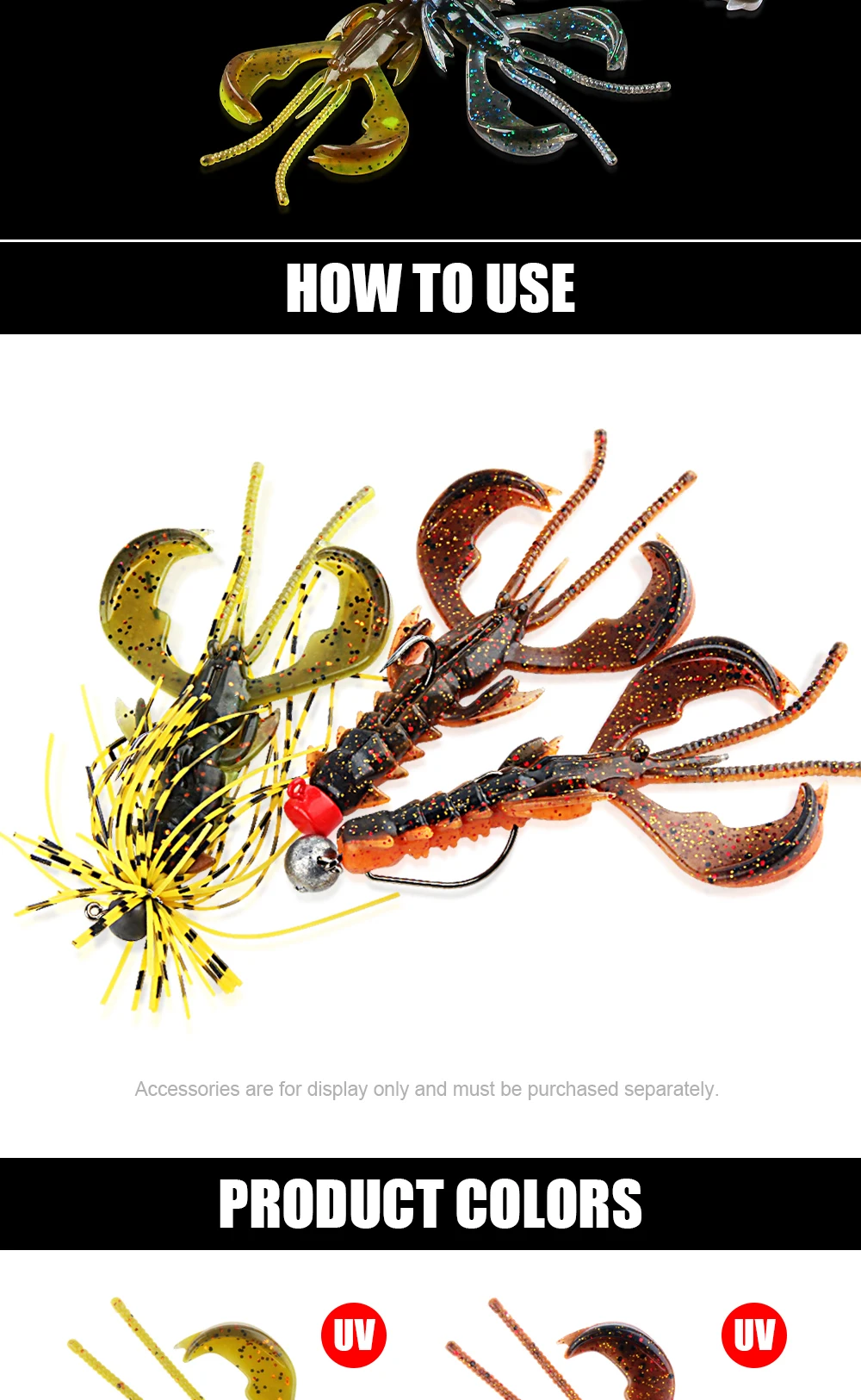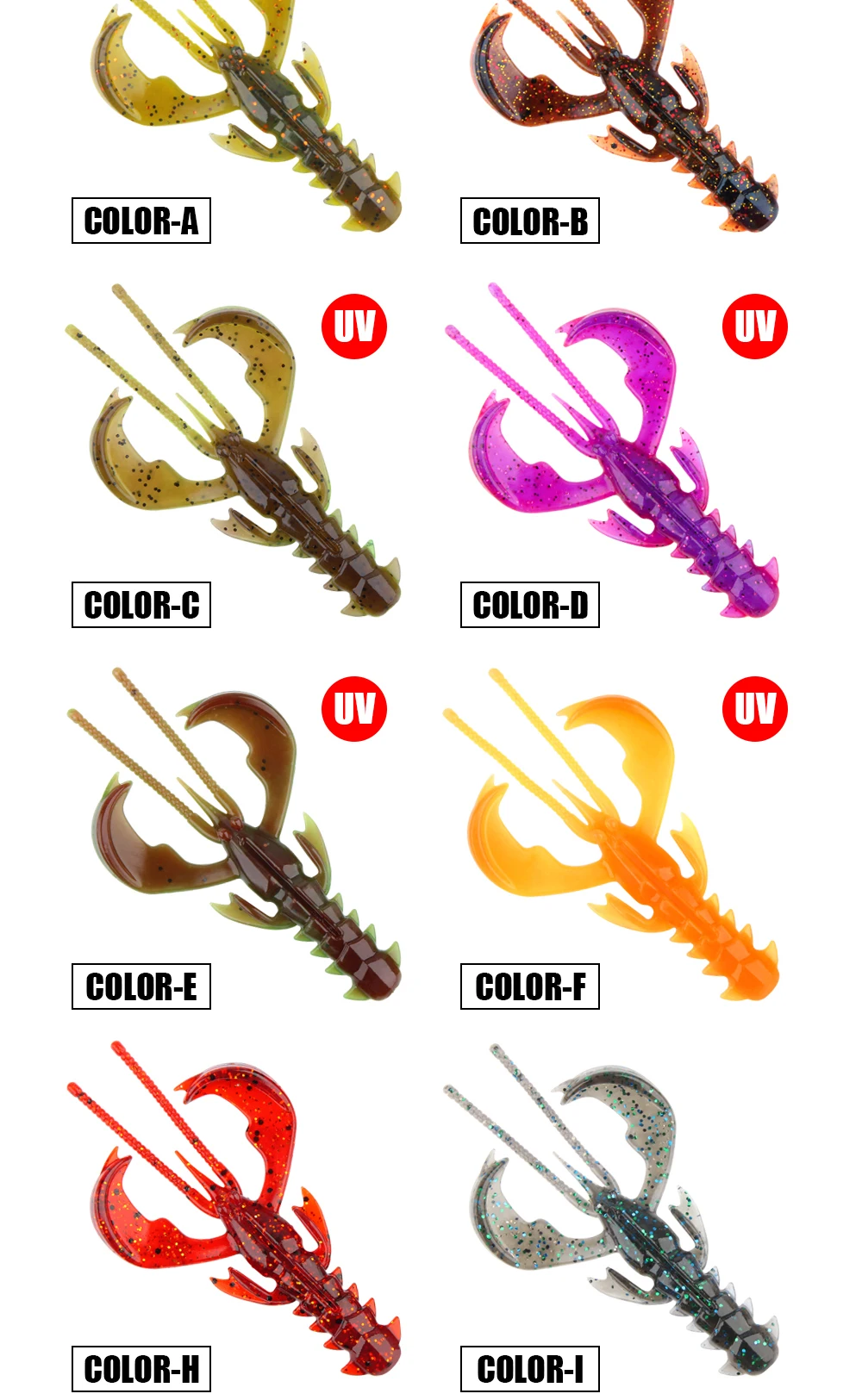 Algunos de los colores de los camarones mejoran los rayos UV para una visibilidad adicional en el agua.
