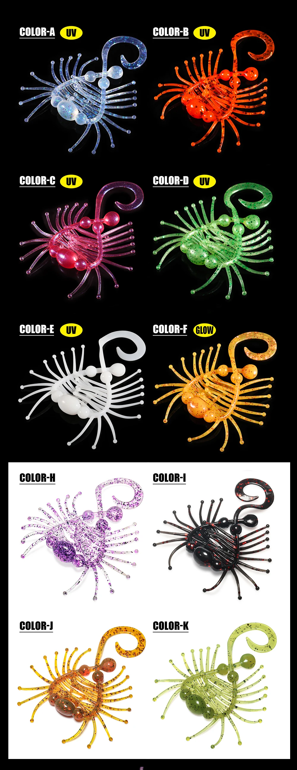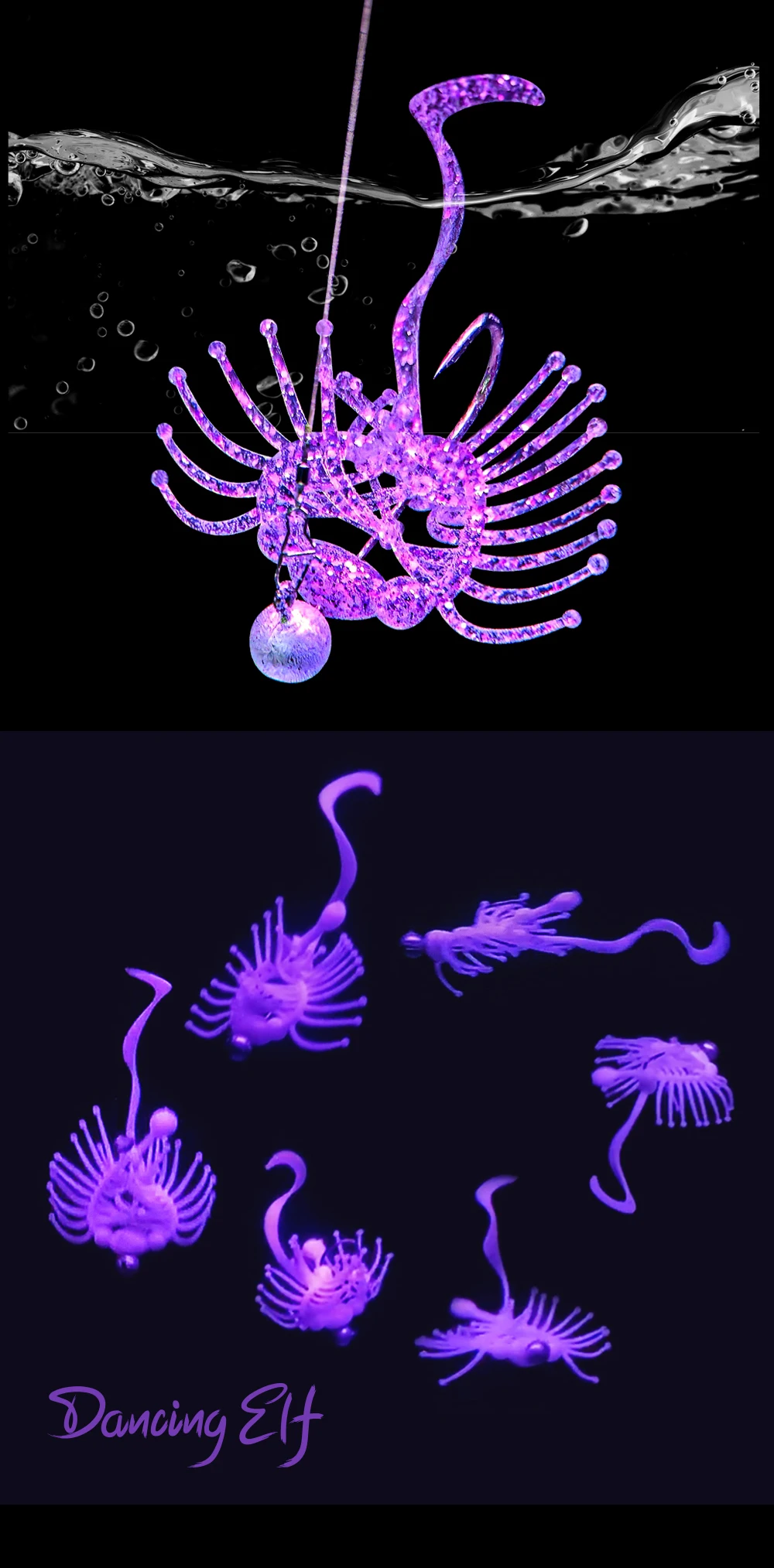 De acuerdo con los hábitos de caza de los peces, nuestro ELF danzante creó una gran bola ondulante, una serie de pequeños tentáculos ondulantes, y una cola extremadamente afilada para hacer que el cebo sea naturalmente vivo en el agua, lo que permite obtener excelentes resultados a través de una búsqueda rápida, lenta y temblores en áreas pequeñas.