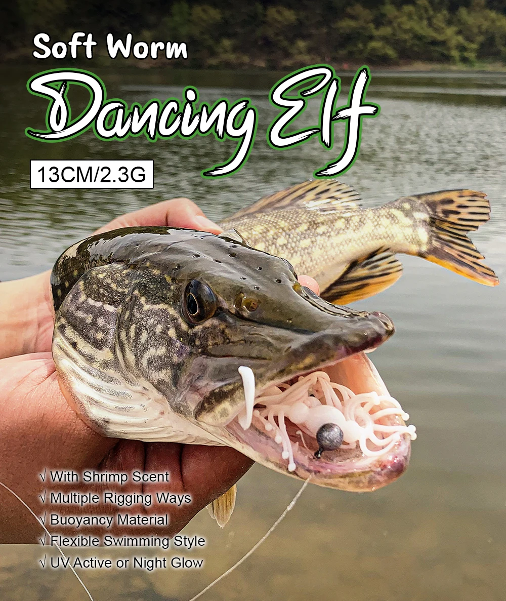 Dancing ELF está hecho de material TPE, que es resistente al desgarro y elástico, facilitando a los pescadores el desarrollo de más formas de aplicar este señuelo y aumentando el número de veces que se puede reutilizar.