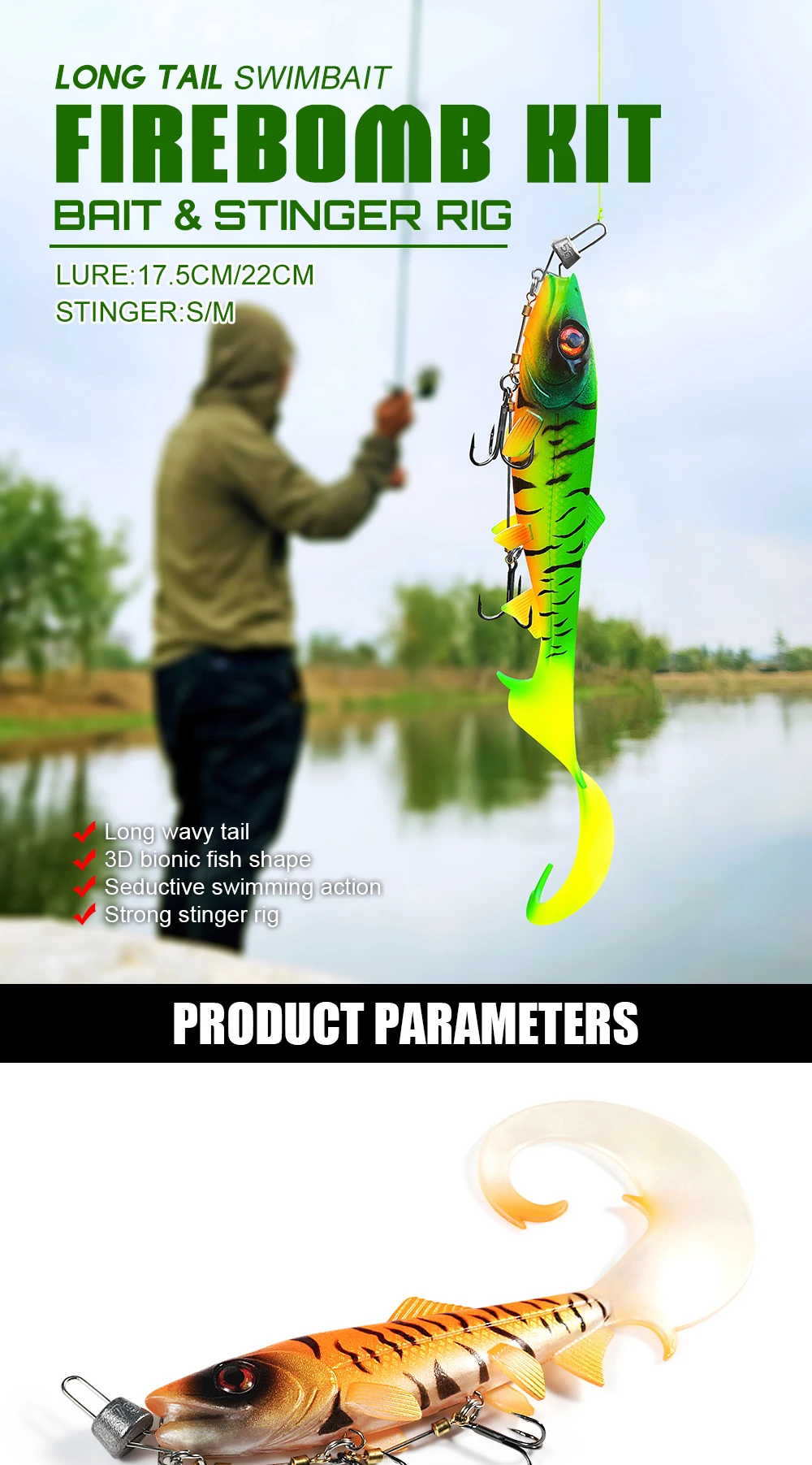 El kit de swimbait Firebomb está disponible en 2 tamaños caprichosos: 17,5 cm - 30 gr Con kit de aparejo de tamaño S 22 cm - 55 gr Con kit de aparejo de tamaño M
