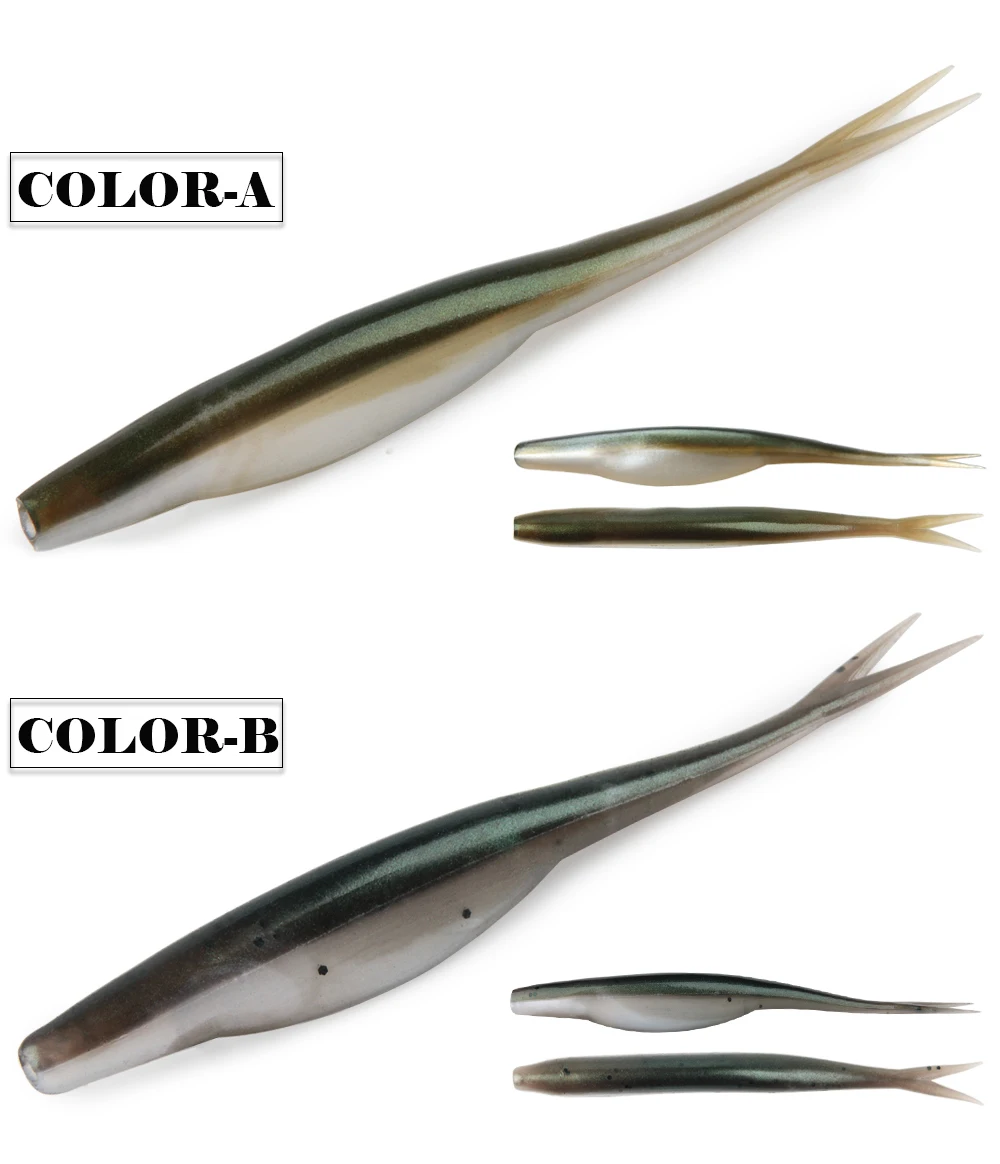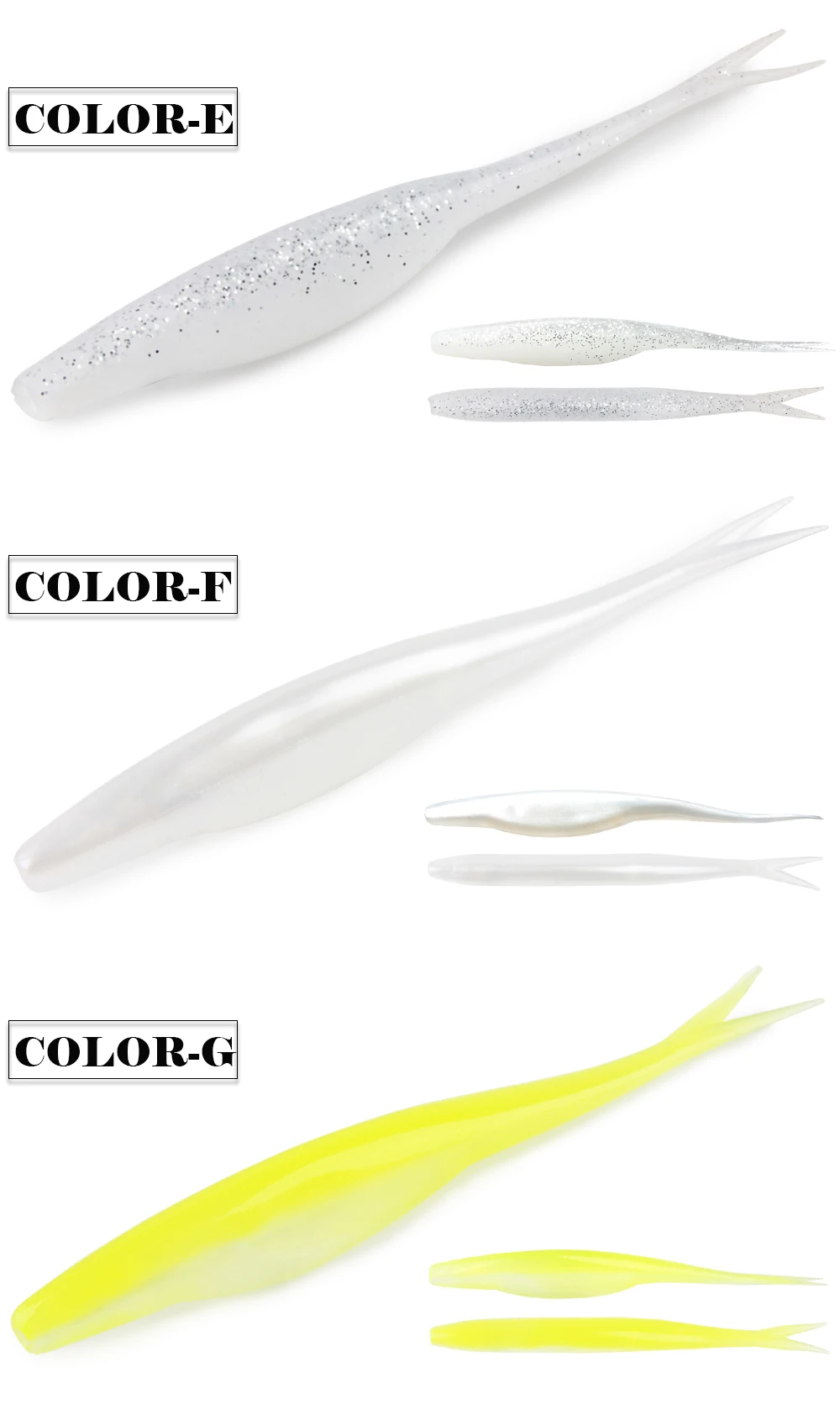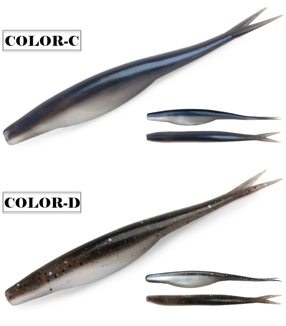Estos jerkbaits de plástico blando tienen un cuerpo delgado y aerodinámico, estrechándose hacia una cola sensible y bifurcada.