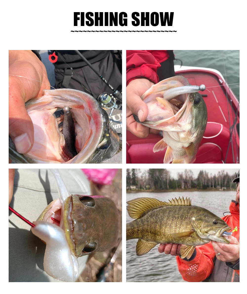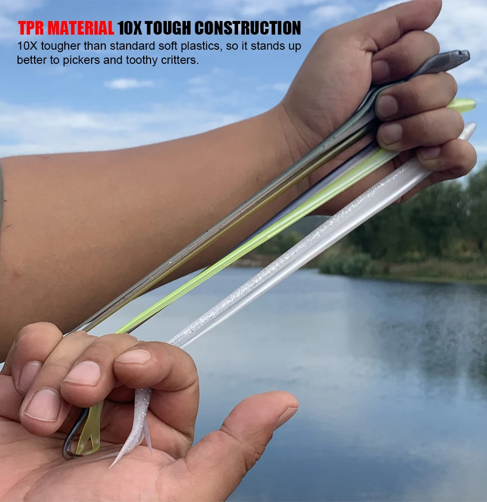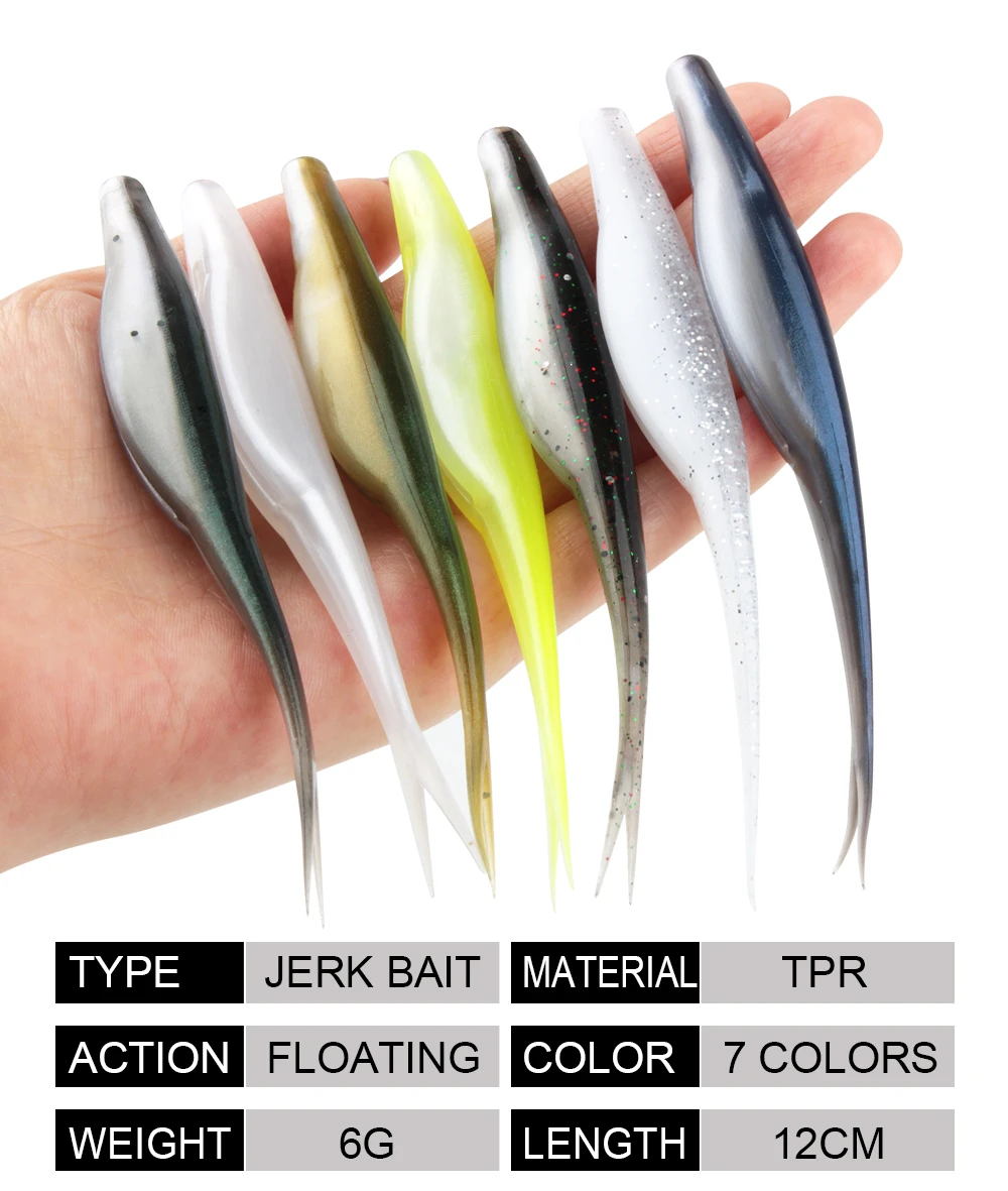 Estos jerkbaits de plástico blando tienen un cuerpo delgado y aerodinámico, estrechándose hacia una cola sensible y bifurcada.