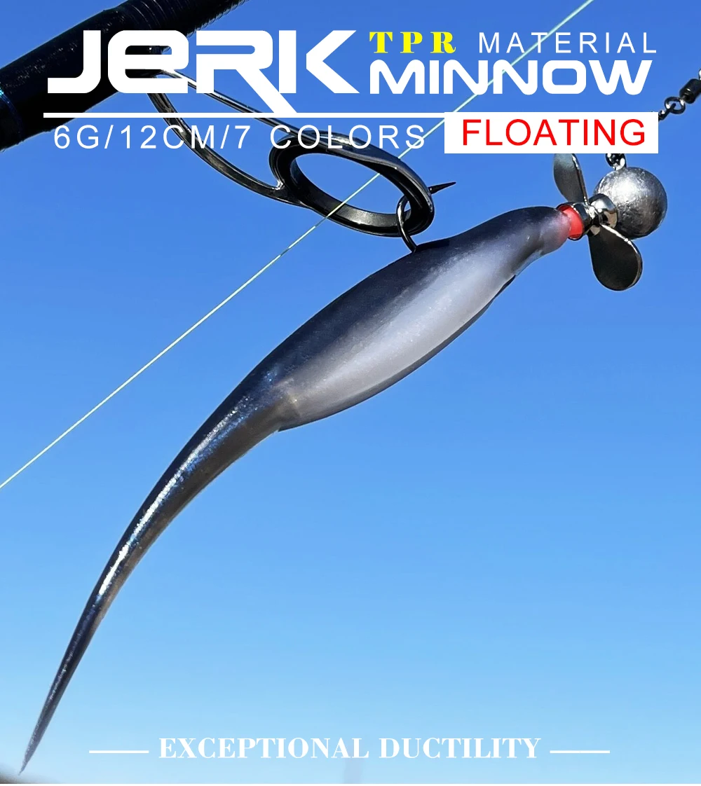 Este Jerk Minnow se puede colocar en la parte posterior de una plantilla de natación con cuchillas, spinnerbait, scrounger, cabeza agitadora o por sí mismo para una acción de deslizamiento lento.