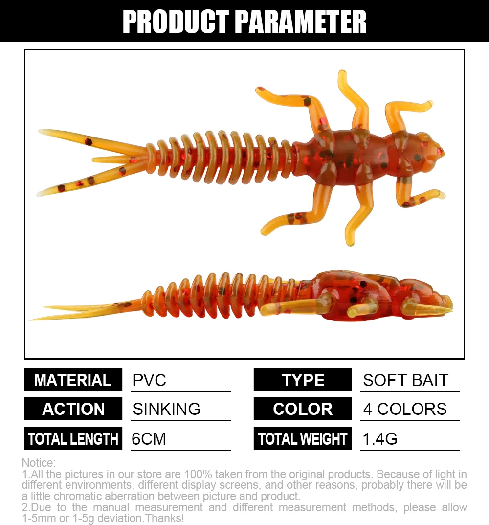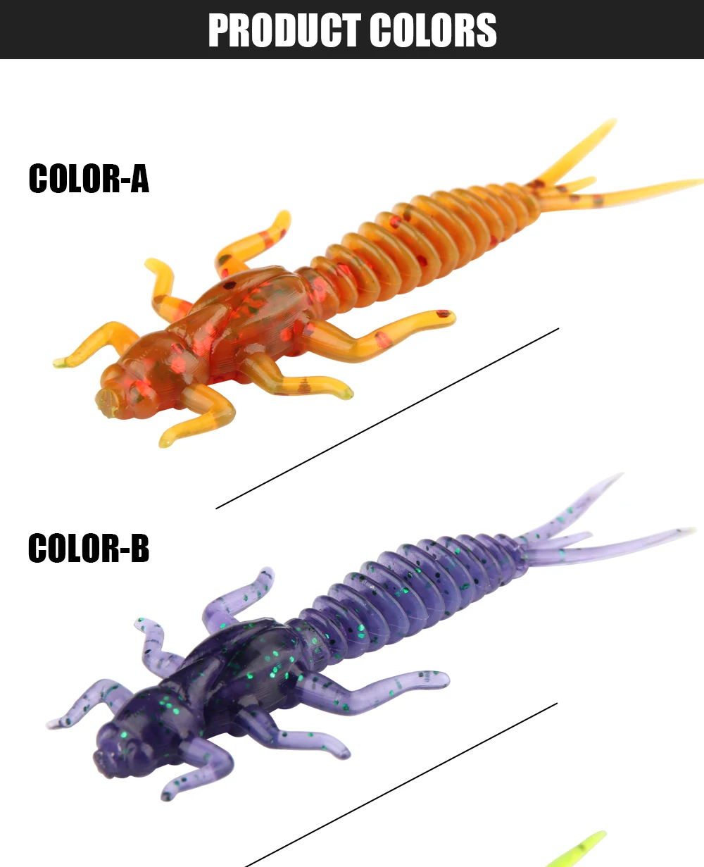 Esto es Larva: una cabeza muy realista y la parte torácica de la larva con patas delgadas entra en un cuerpo plano masivo, completamente cubierto con costillas anulares. El insecto vivo no tiene esto, pero esta superficie del cuerpo proporciona la simulación más precisa de las sensaciones de un depredador, agarrando el cuerpo tierno de esta presa.