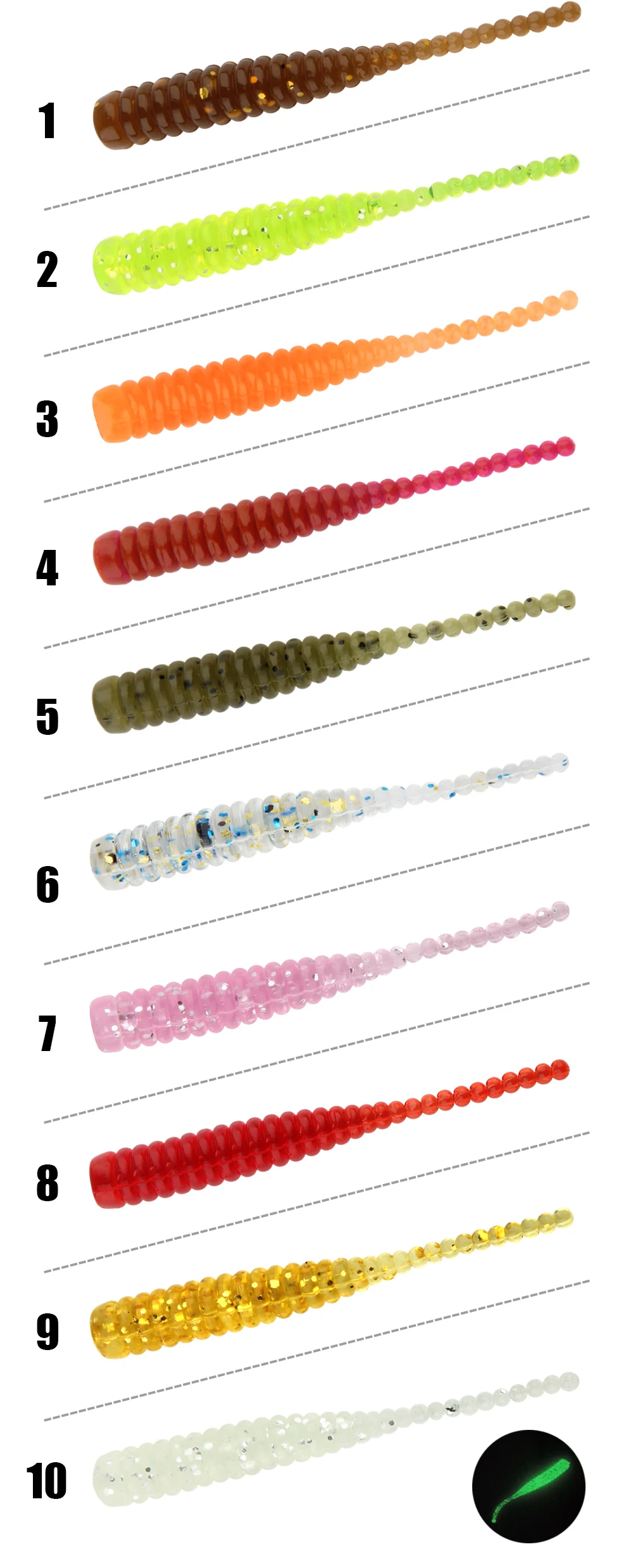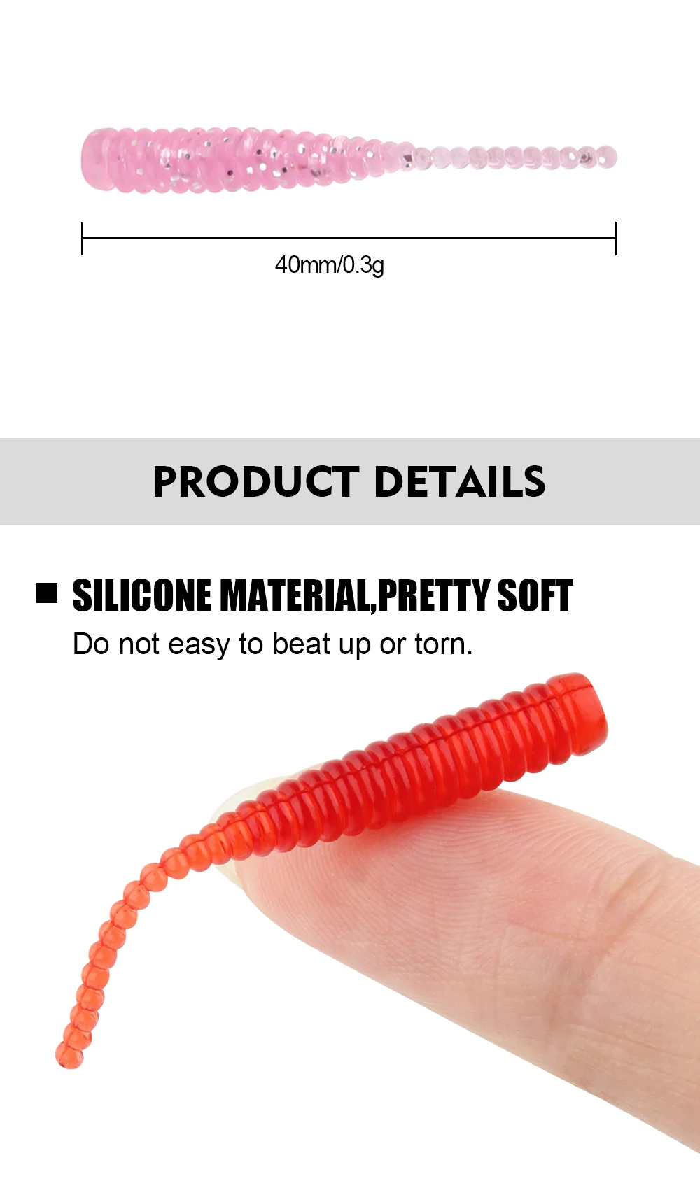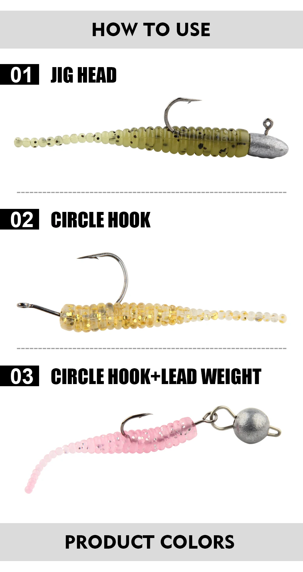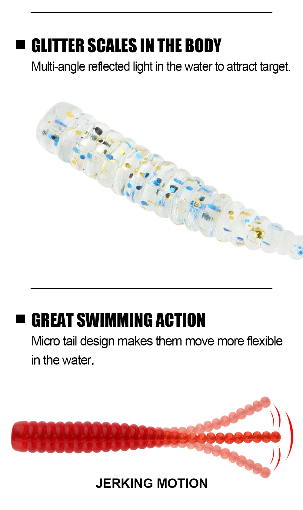 Estos señuelos de pesca blandos tienen un diseño de microcola que los hace moverse más flexibles en el agua. Los señuelos de pesca blandos con micro cola tienen una buena acción de natación y el tamaño es perfecto. Los señuelos de pesca Micro Tail se pueden aparejar tanto con cabezales Jig, Texas Rig, Split Shot Rig, también pueden colocarlos en spinnerbaits como remolques o usarlos solos sin peso para imitar a un pececillo lesionado para lubina.