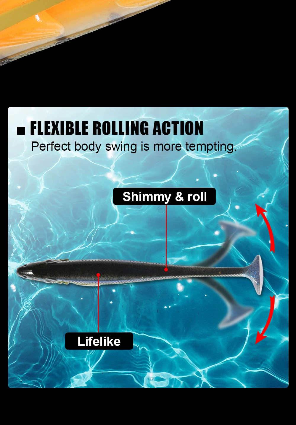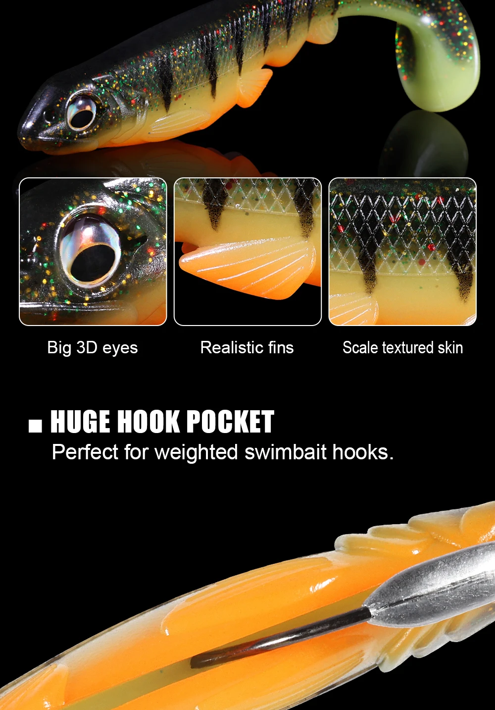 Stalker Swimbait Soft Fishing Lure tiene una impresionante acción de natación y características de cebo natural, que incluyen un atractivo patrón de escamas, aletas y placas de branquias.