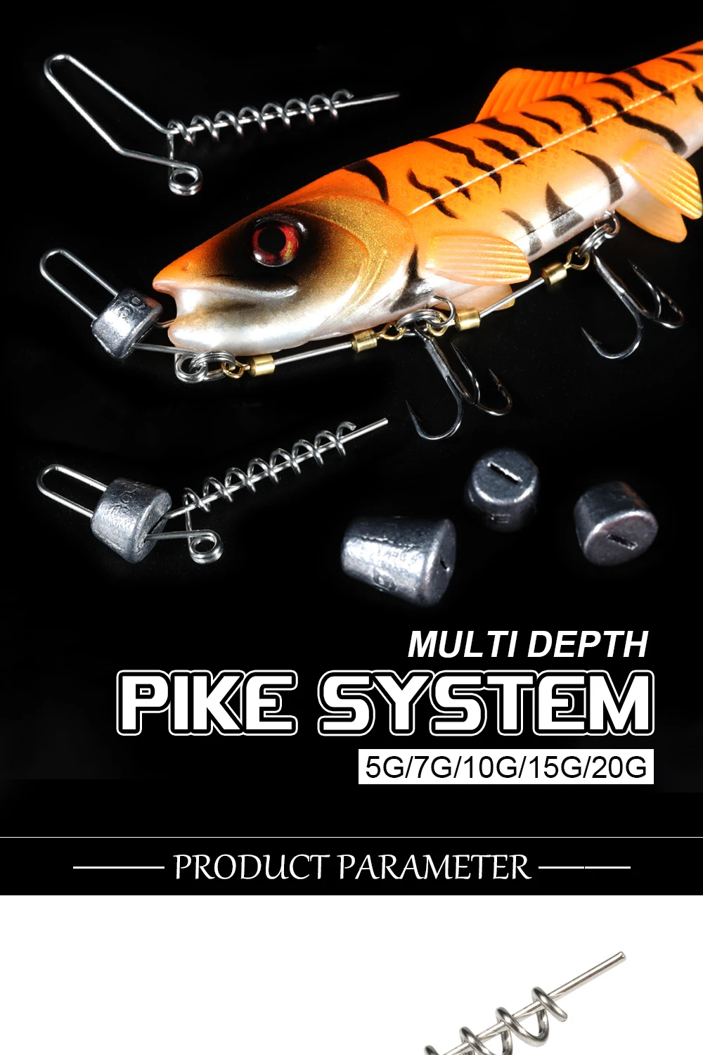 Spinpoler El sistema de lucios utiliza un diseño especial de tornillo en espiral con un acabado de doble extremo que sujeta de forma segura los softbaits. Perfore el cebo en el medio y atorníllelo mientras aplica presión al tornillo. Cada tornillo de acero inoxidable tiene un ojo fijo en la parte inferior que forma una conexión segura con la plataforma. El diseño de ángulo único general evita que los softbaits (especialmente los curlails) gire. El tornillo universal se puede combinar con 5 pesos diferentes que van desde 5 a 20 g. Cada peso de tornillo está diseñado con una cónica interior para que se ajuste cómodamente a los tornillos. Con este sistema, una vez que el Pike Screw esté conectado a su señuelo, simplemente puede cambiar el peso para adaptarlo a la profundidad o velocidad que desea pescar.