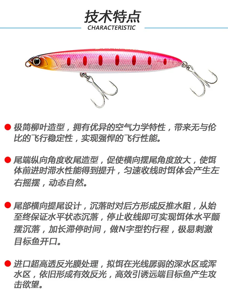 (3). El diseño de elevación horizontal de la cola forma una resistencia al agua inversa en la parte trasera cuando se hunde, asegurando el hundimiento horizontal desde el principio hasta el final. Detener la línea para realizar el hundimiento del temblor horizontal del cuerpo del cebo, alargar el tiempo de estancamiento, hacer N El trazo de pesca de la fuente estimula fácilmente la apertura del pez objetivo.