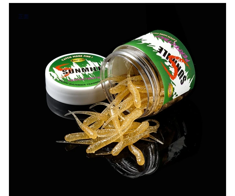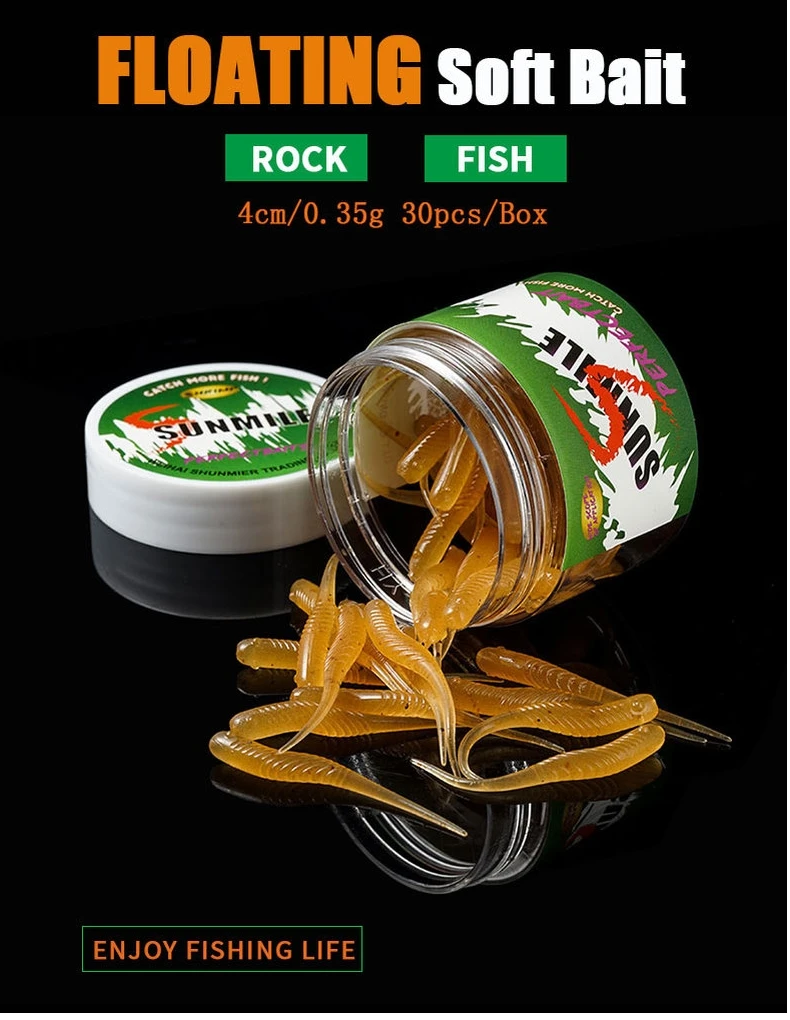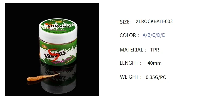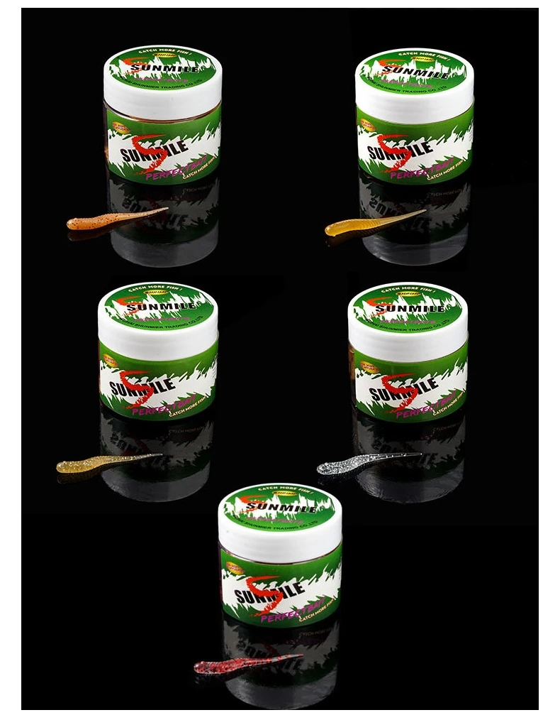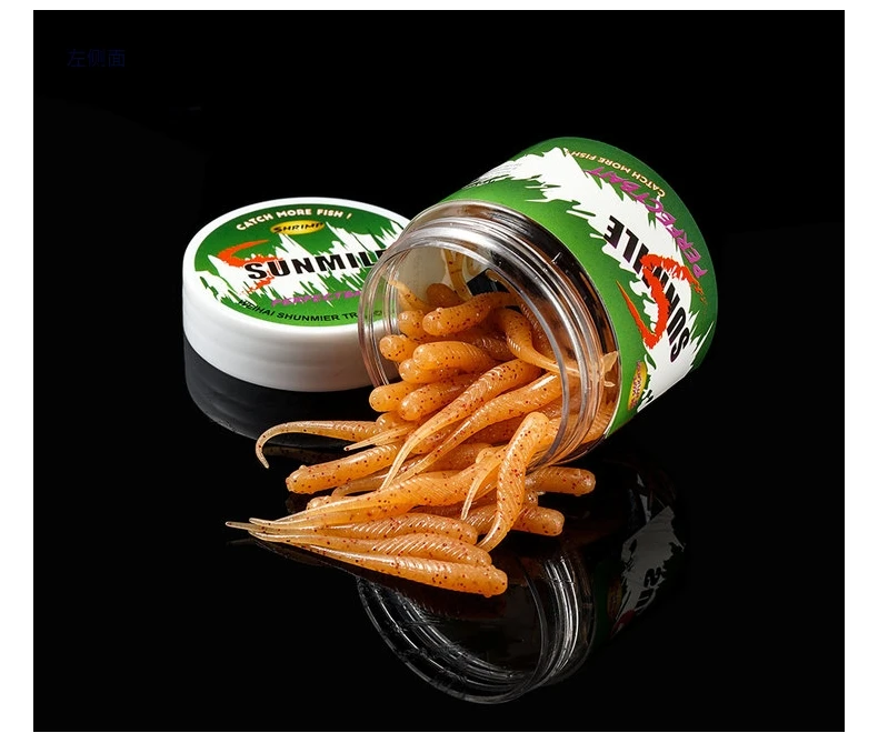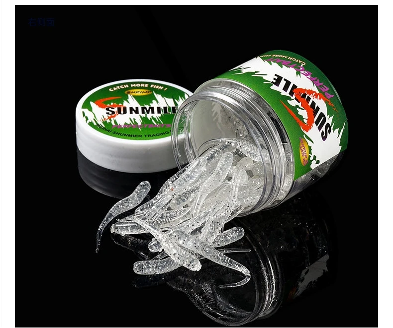 Marca: SUNMILEColores: 5 coloresCantidad: 30 piezas/loteMaterial: TPRLongitud del artículo: 40mmPeso del artículo: 0,34gTipo: olor a pescado/olor a CamarónEmbalaje: botella de plástico cilíndrica