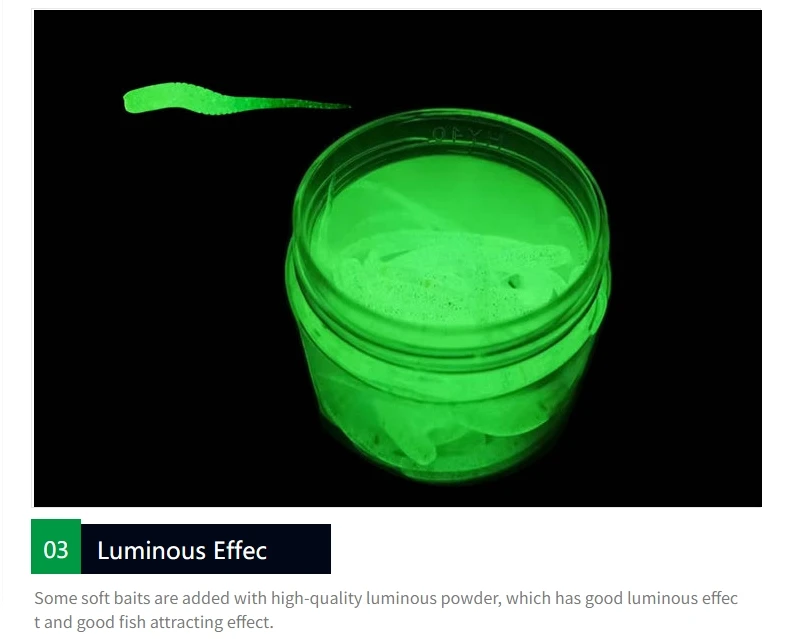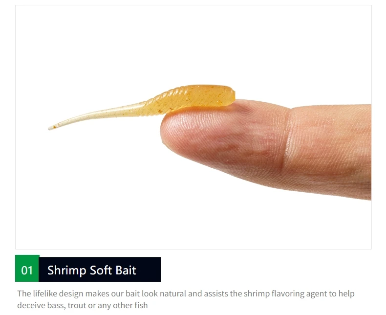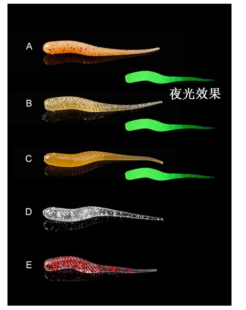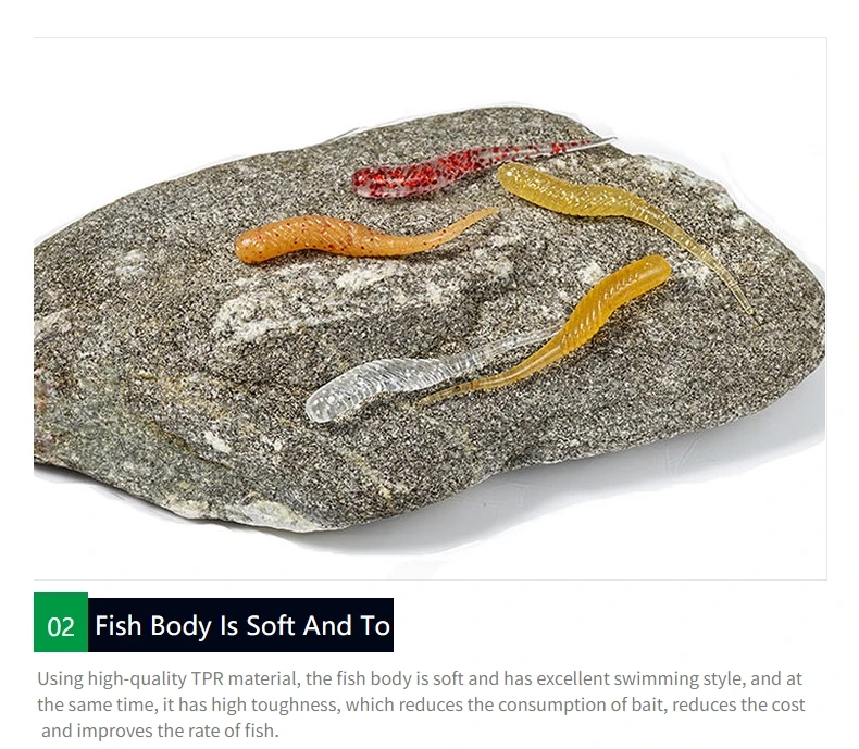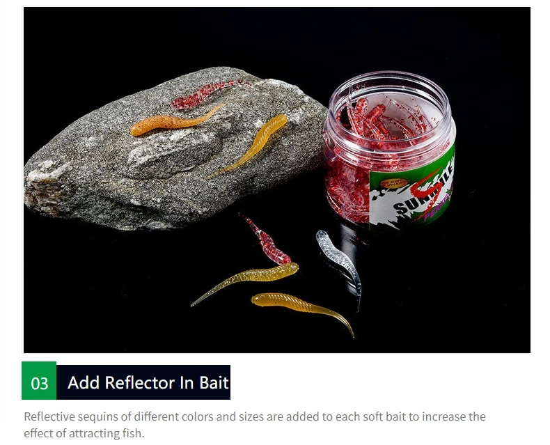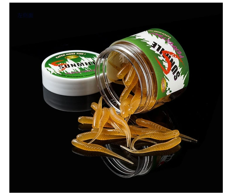 Marca: SUNMILEColores: 5 coloresCantidad: 30 piezas/loteMaterial: TPRLongitud del artículo: 40mmPeso del artículo: 0,34gTipo: olor a pescado/olor a CamarónEmbalaje: botella de plástico cilíndrica
