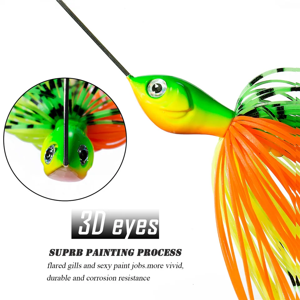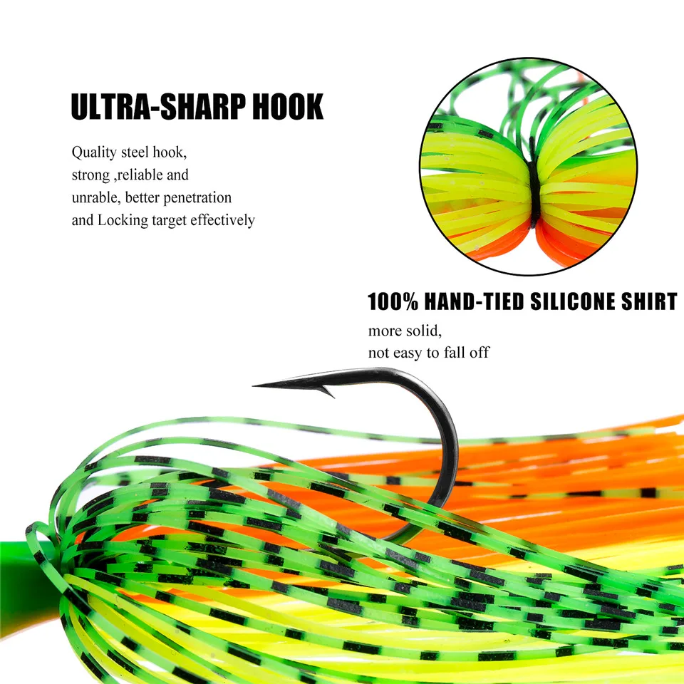 【Superb Painting Process】:for maximum flash and corrosion resistance , realistic bright colored head and heavy silicone skirt,strengthening the lure's visibility.