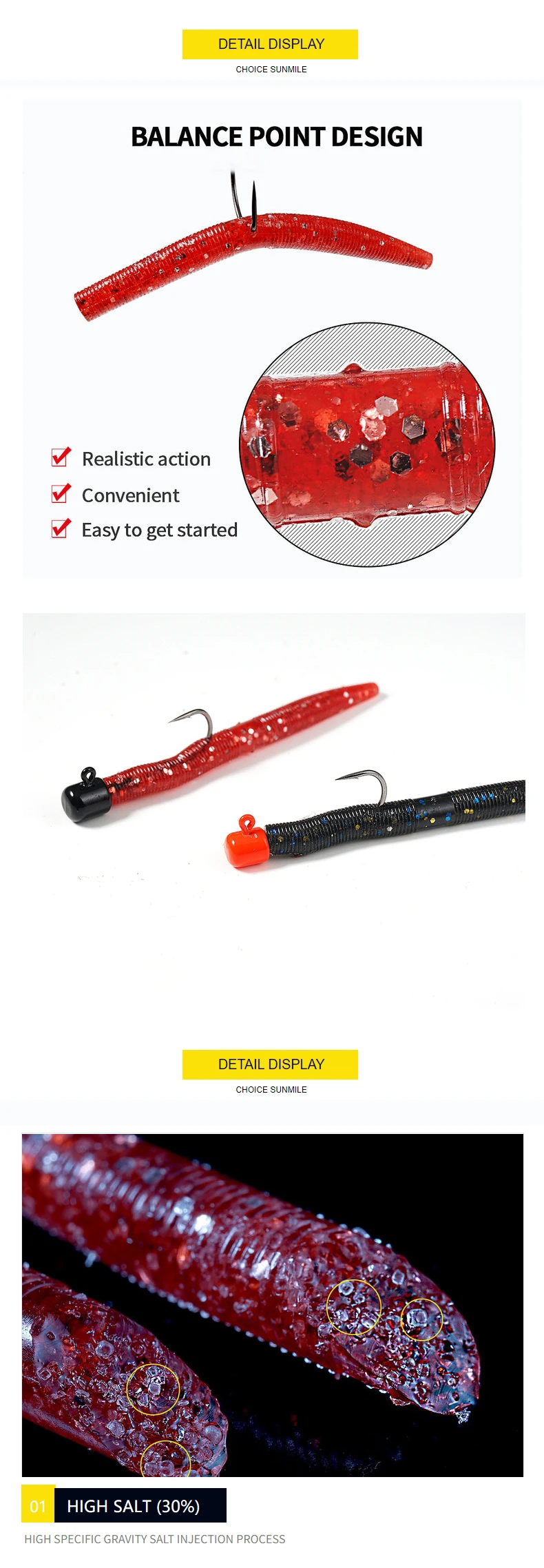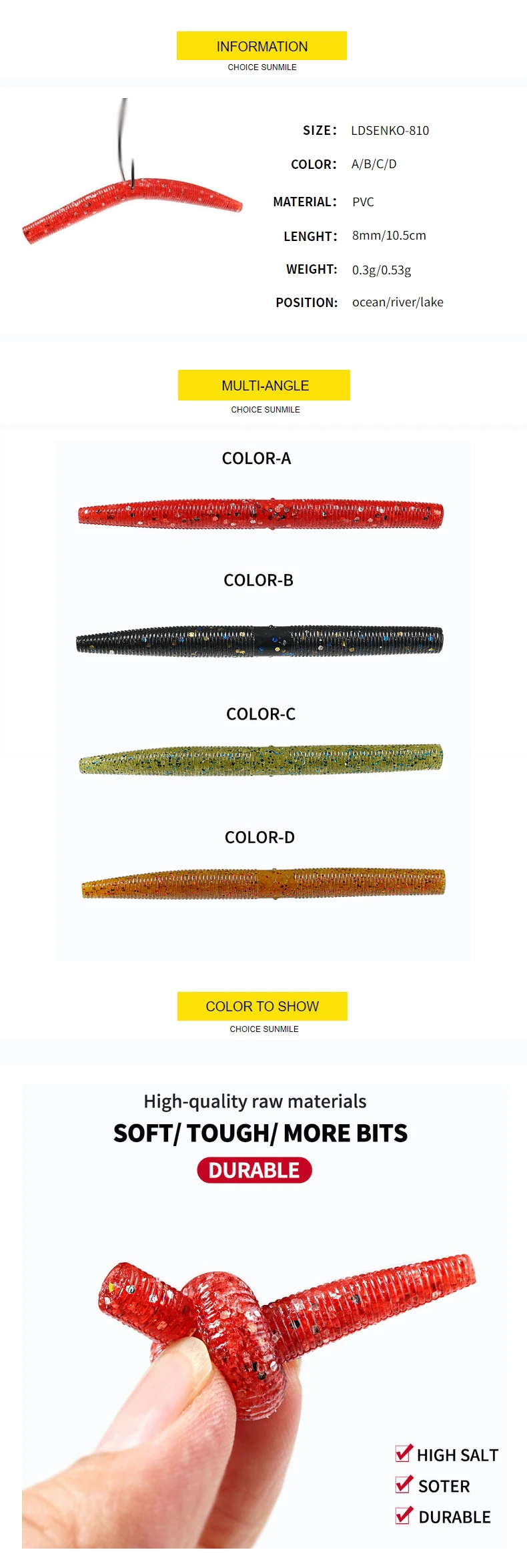El gusano Senko presenta un nuevo diseño, que crea una sutil acción temblorosa en la parte inferior con sacudidas desde la varilla. El cuerpo acanalado también produce vibraciones muy suaves que estimulan la línea lateral de los peces y los folia al pensar que en realidad es presa viva.