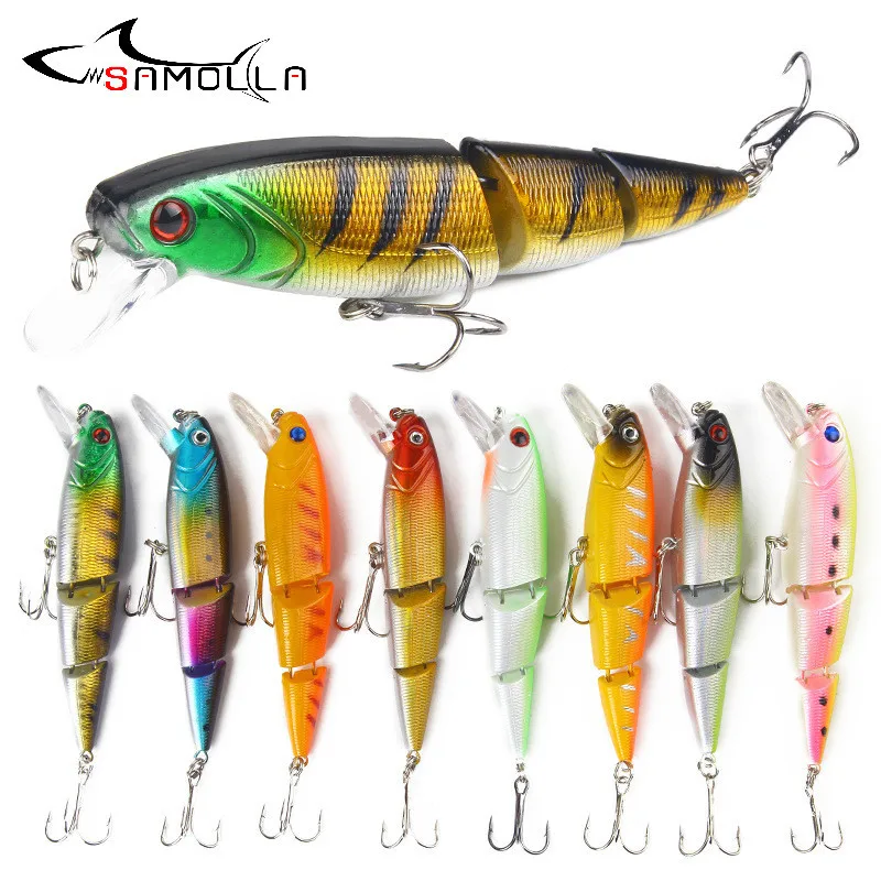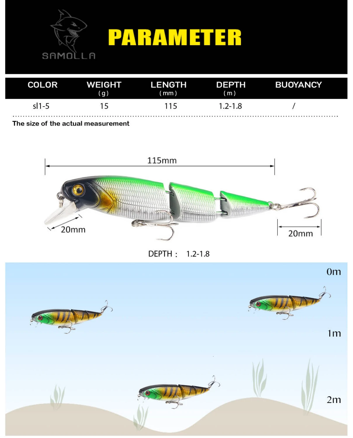 Detalles del producto: Marca: SAMOLLA Modelo de señuelo: Swimbaits Tipo de señuelo: señuelo de pesca duro Peso del señuelo: 15g Longitud del señuelo: 115mm Profundidad de buceo: 1,2-1,8 M Flotabilidad: Ganchos: equipados con ganchos anticorrosión de la marca: Ojos: ojos de pez 3D Anillos: bicíclicos Colores: colores