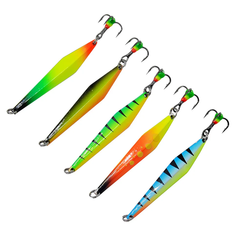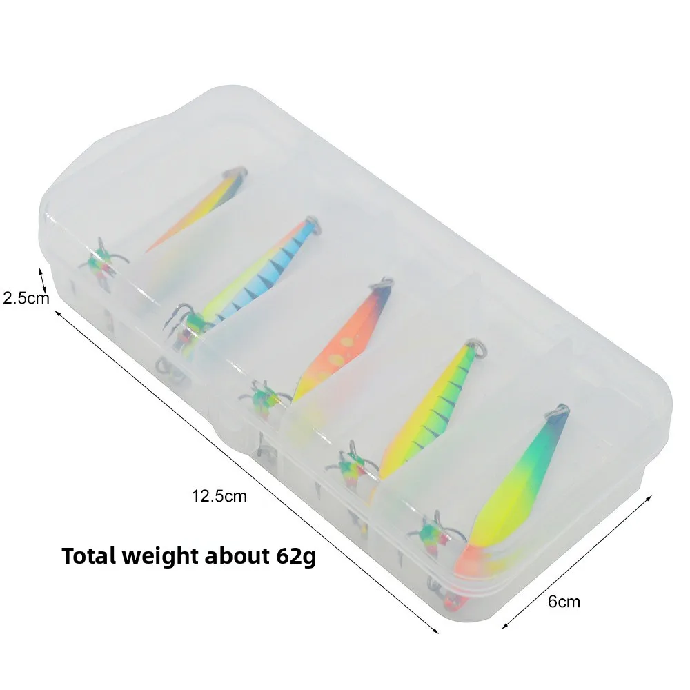SWOLFY 5 uds. Señuelos de pesca en hielo de invierno cucharas 5g 5,5 cm plantillas de aleación de Zinc Micro peces señuelos artificiales cebo duro de Metal