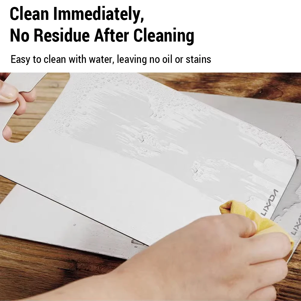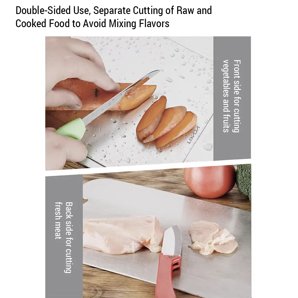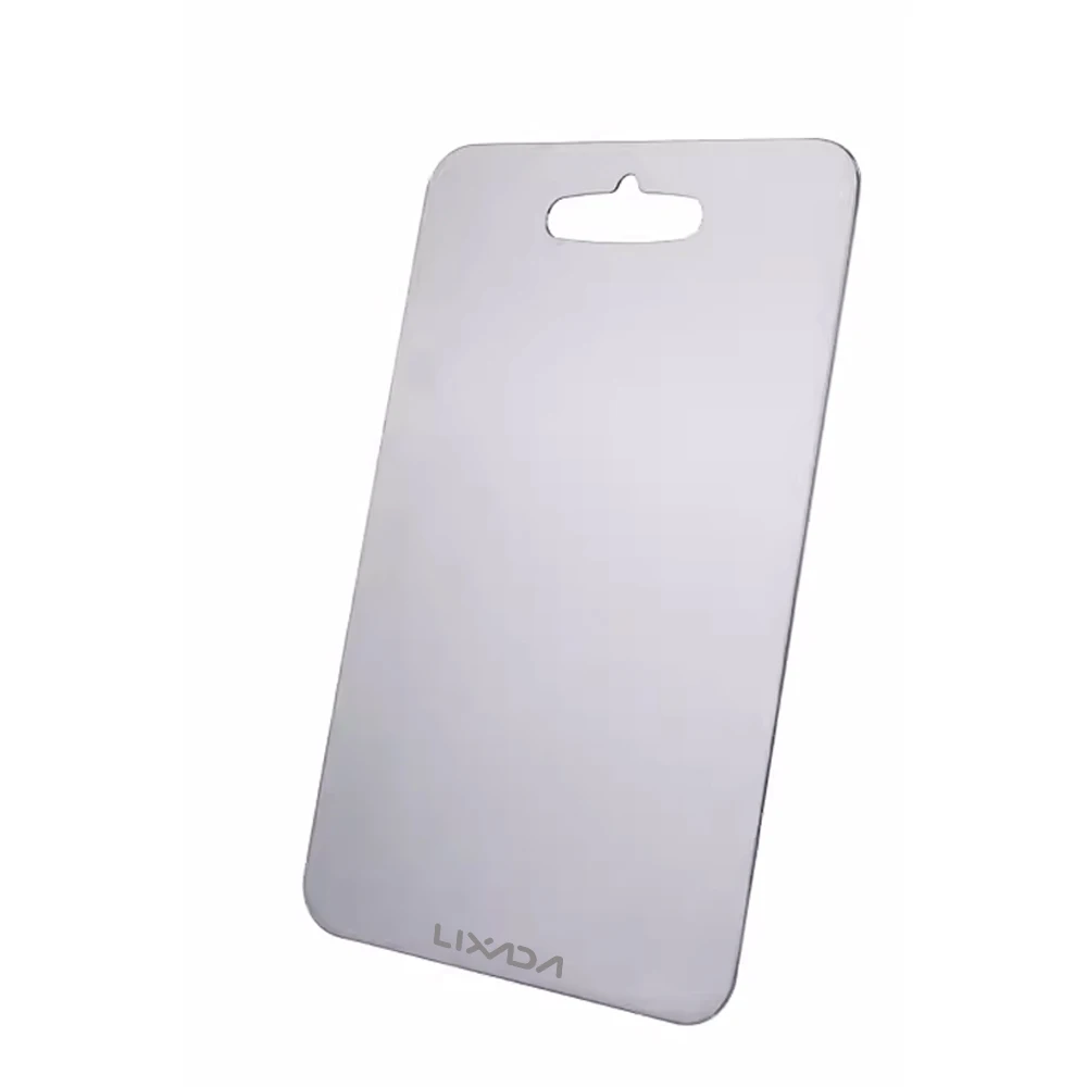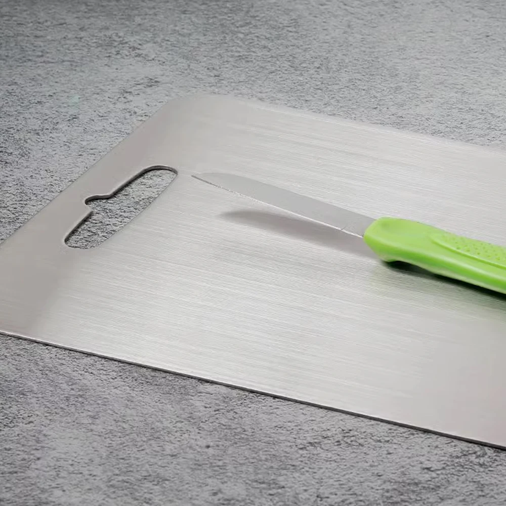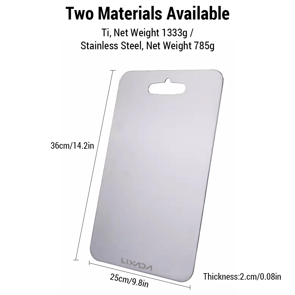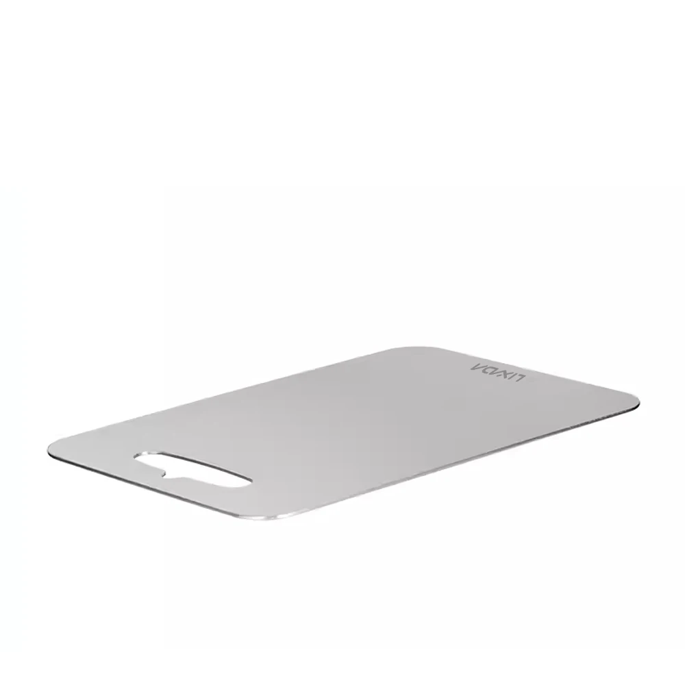 Esta tabla de cortar de metal es imprescindible para todas las cocinas y campamentos al aire libre. La tabla de cortar es fácil de limpiar y no deja residuos. Cuenta con un diseño de doble cara, lo que le permite separar diferentes ingredientes de alimentos para evitar la contaminación cruzada. Elija entre dos materiales, Ti y acero inoxidable, para satisfacer sus necesidades.