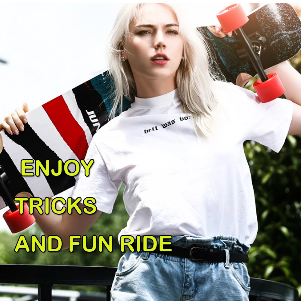 Mejor Control: equipado con papel de lija impermeable y respetuoso con el medio ambiente que proporciona alta fricción y fuerte antideslizante, el papel de lija de esmeril a juego con el clásico diseño cóncavo de doble patada le proporciona una experiencia de seguridad y un mejor control, también te ayuda a aprender más trucos fácilmente.